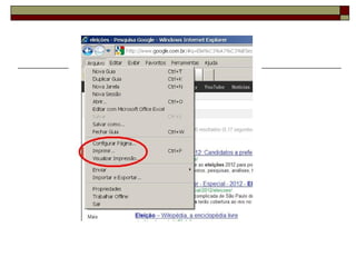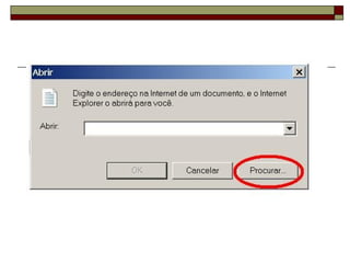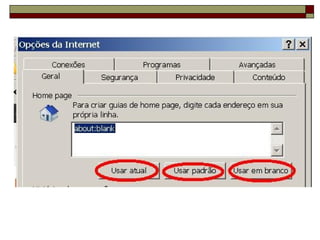 Este documento fornece instruções sobre como usar o navegador Internet Explorer, descrevendo sua tela principal, botões principais e como realizar funções como abrir várias janelas, salvar páginas, localizar palavras e configurar a página inicial.