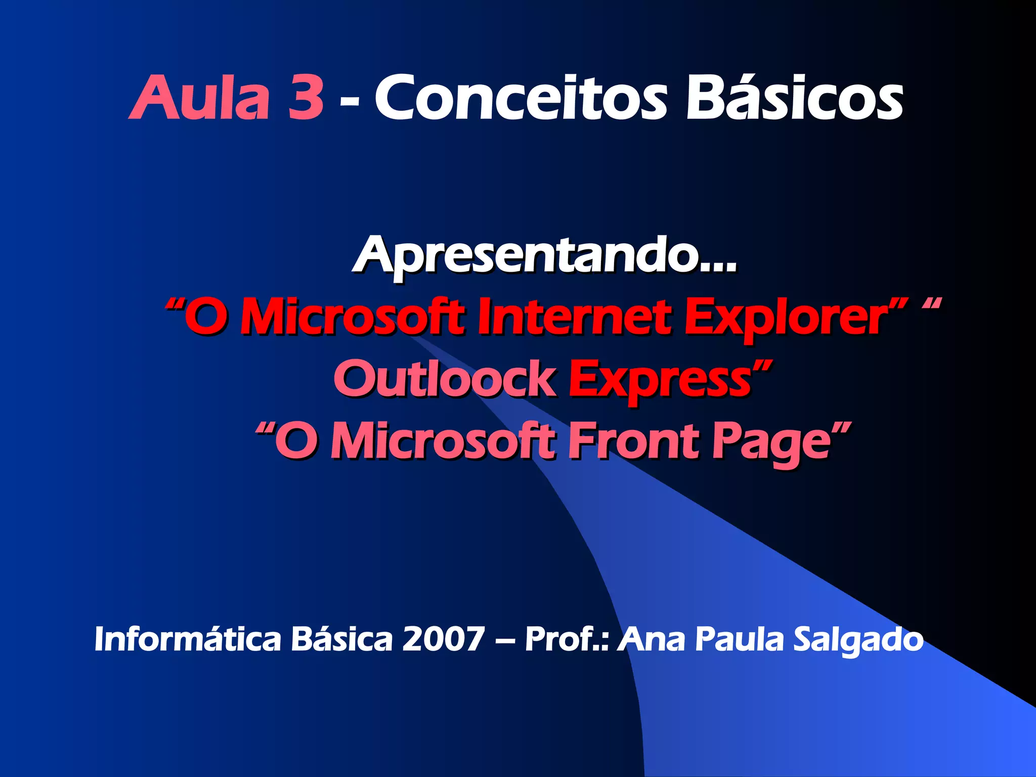 O documento apresenta conceitos básicos sobre a Internet, incluindo: (1) Como surgiu a Internet e sua evolução até os dias atuais; (2) O que significa a Internet e a World Wide Web; (3) Como se conecta à Internet, necessitando de computador, linha telefônica, modem e provedor de acesso.