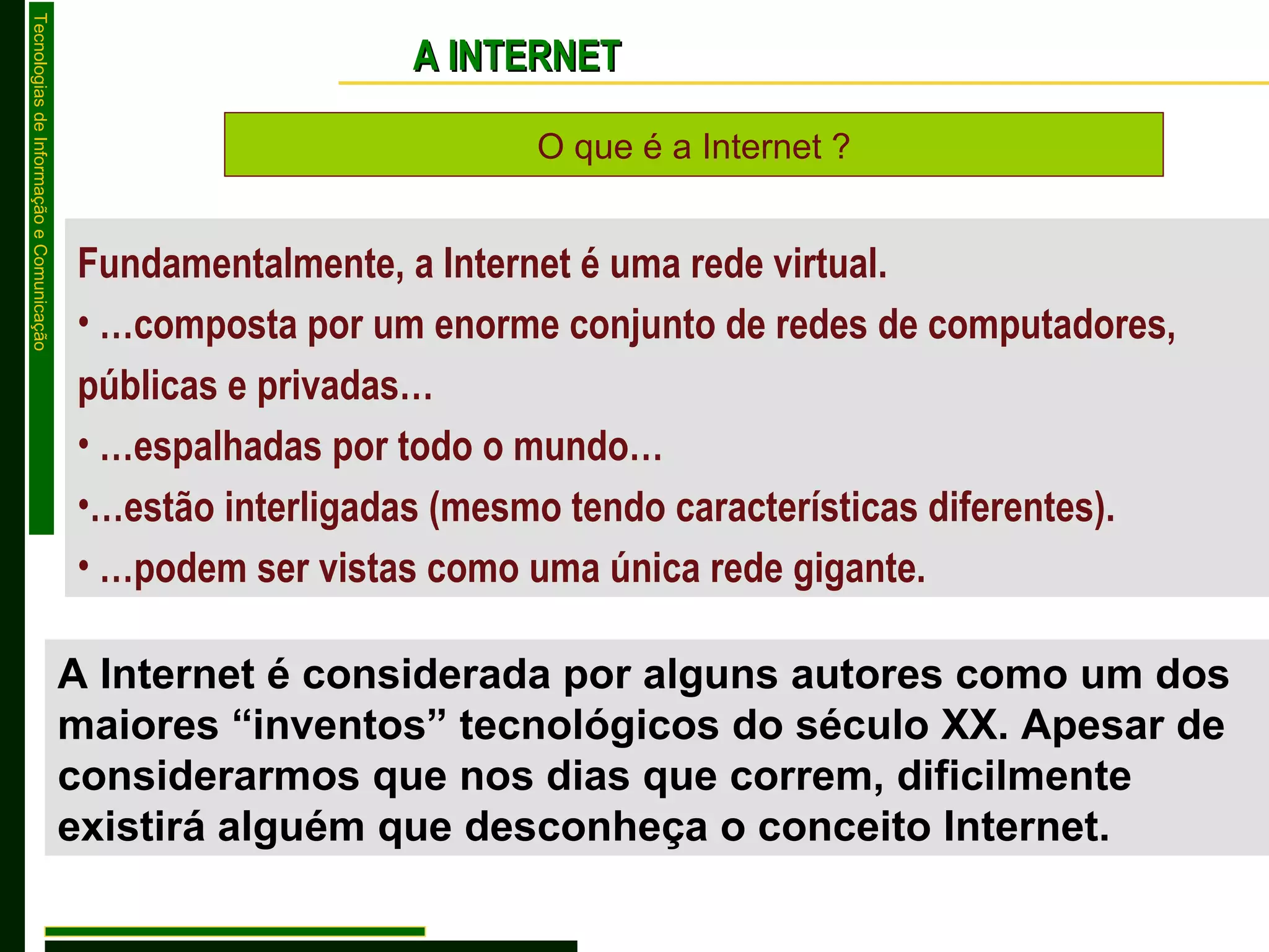 O documento descreve o que é a Internet, sua história e como funciona. A Internet é uma rede global de redes de computadores interligadas que permite o compartilhamento de informações através de diversos serviços como e-mail, World Wide Web e transferência de arquivos. Seu desenvolvimento teve início na década de 1960 com o projeto militar americano ARPANET.