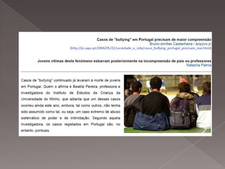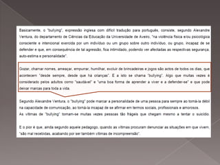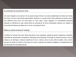 O documento discute o bullying e cyberbullying, fornecendo definições, exemplos de casos, e informações sobre as leis portuguesas contra violência escolar. Também discute ética nas redes sociais e fornece dicas sobre privacidade e segurança online.