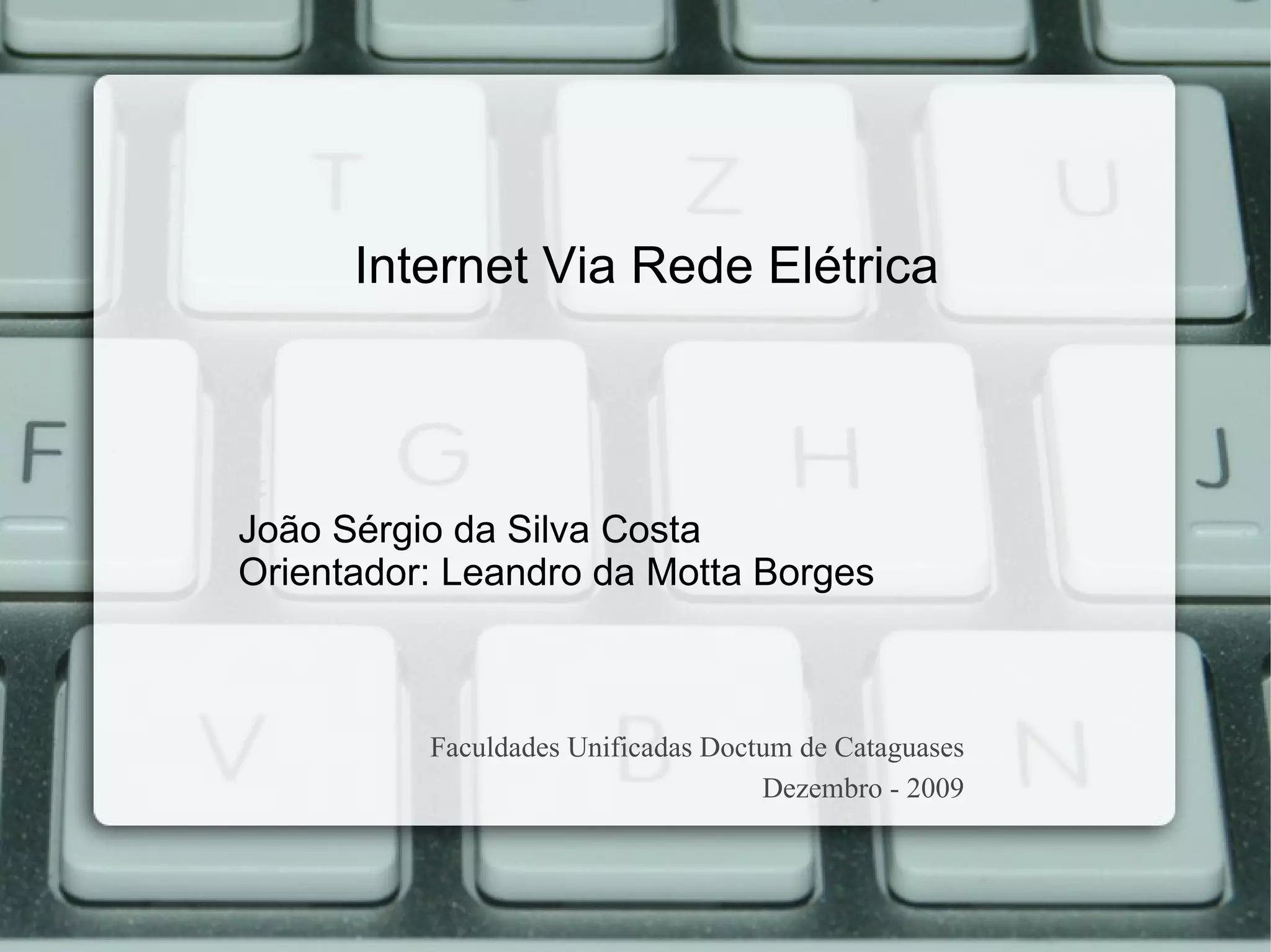 O documento discute a tecnologia Power Line Communication (PLC) que permite transmissão de dados pela rede elétrica. Apresenta as vantagens do PLC, como já ter infraestrutura instalada e suportar altas taxas de transmissão. Também descreve projetos piloto realizados no Brasil pela CEMIG e COPEL para testar a viabilidade do PLC.