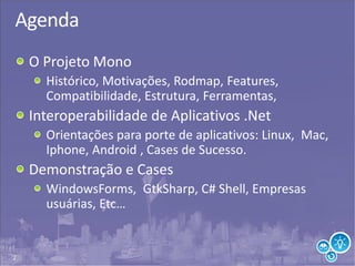 O documento discute o Projeto Mono, que permite o desenvolvimento e execução de aplicações .NET em ambientes não Windows. Ele aborda o histórico do projeto, suas motivações, recursos, compatibilidade, ferramentas e casos de sucesso na portabilidade de aplicações para Linux, Mac, iPhone e Android. Demonstrações de aplicações como WindowsForms, C# Shell e empresas que usam Mono também são apresentadas.