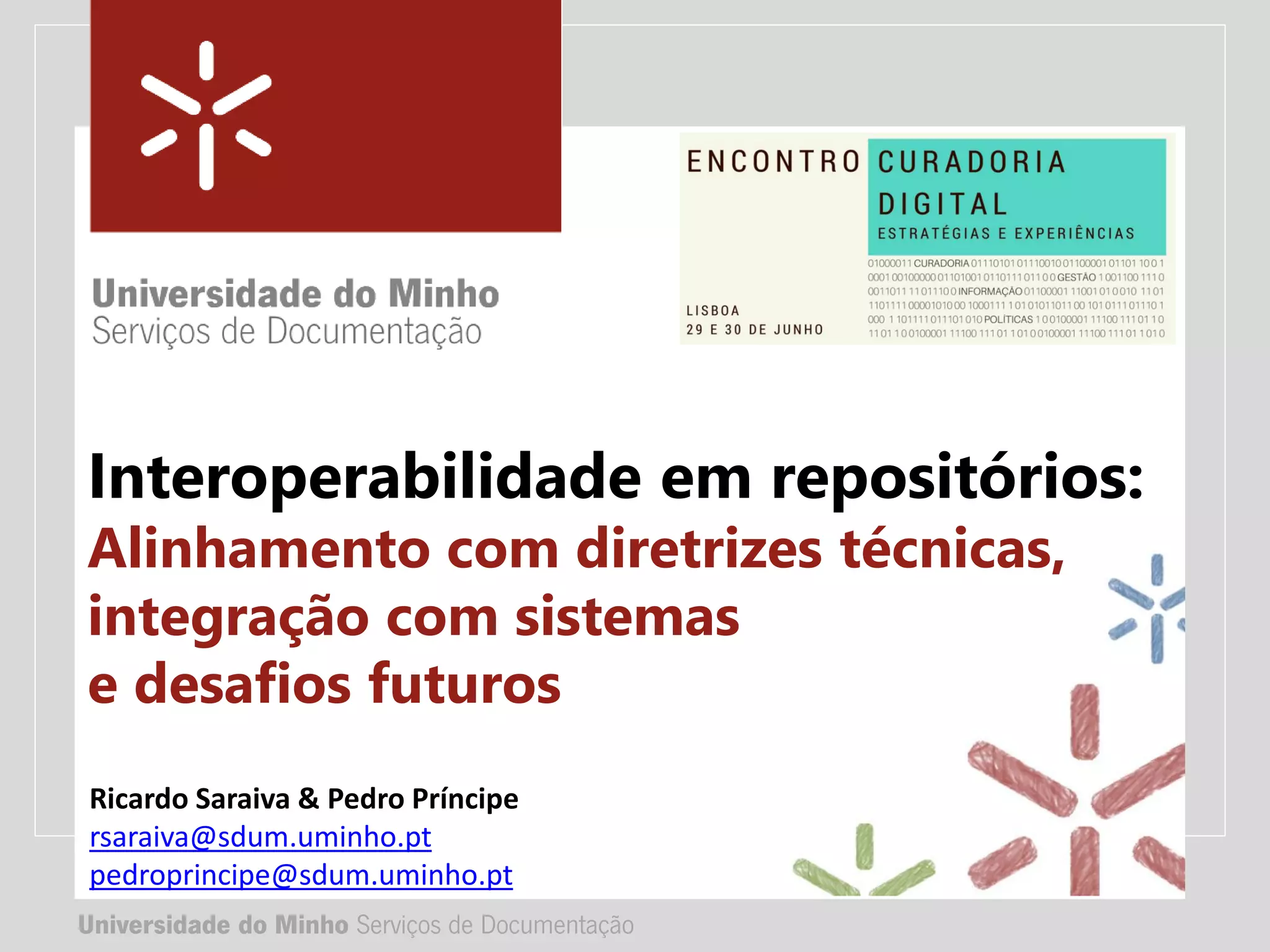 O documento aborda a importância da interoperabilidade em repositórios científicos e académicos, destacando que, embora cada repositório tenha valor individual, seu verdadeiro potencial é realizado através da conexão e integração com outros sistemas. Ele propõe desafios futuros como a heterogeneidade de conteúdos, necessidade de diretrizes consistentes e sustentáveis, além da colaboração entre organizações. A conclusão enfatiza que um espaço global de conhecimento aberto depende da colaboração e padronização entre repositórios.