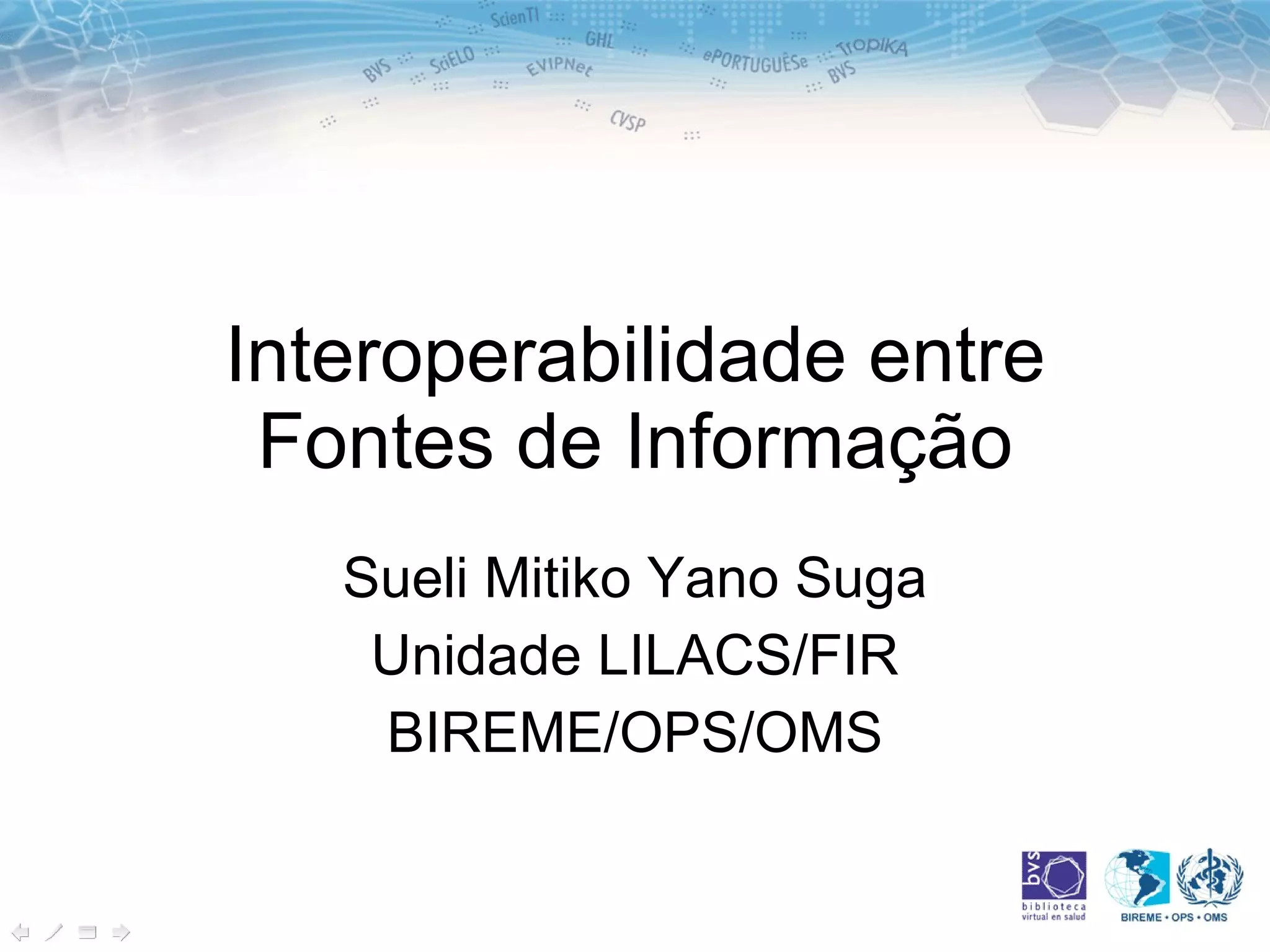 Este documento discute a interoperabilidade entre fontes de informação, definindo fontes de informação e níveis de interoperabilidade. Também aborda a interoperabilidade da base de dados LILACS e demandas de atualização de sua metodologia, como a conversão de seus campos mínimos para o formato Dublin Core Qualified.