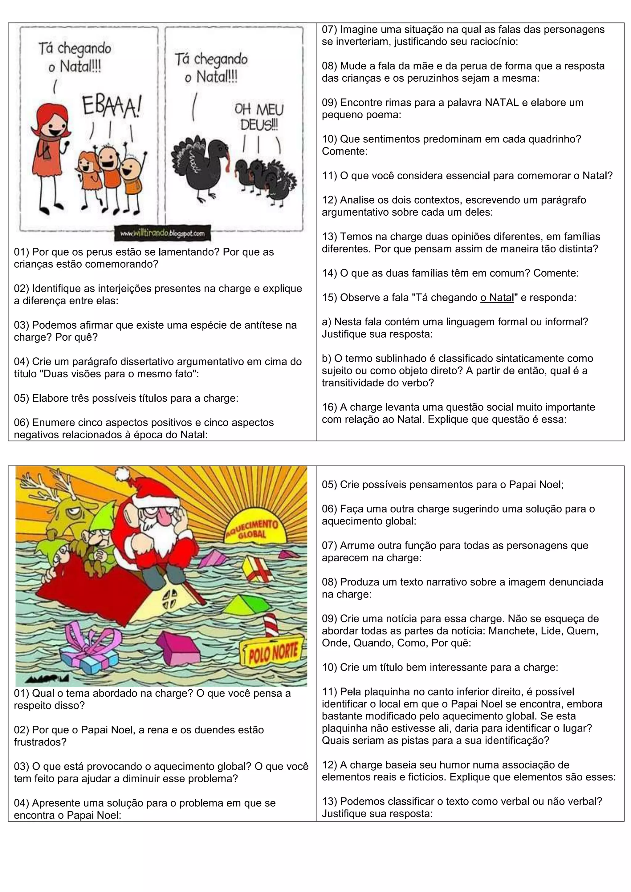 Este documento apresenta 15 questões sobre duas charges natalinas. A primeira charge mostra perus lamentando enquanto crianças comemoram o Natal. A segunda charge apresenta duas famílias com visões diferentes sobre o Natal. As questões pedem análise dos sentimentos, diálogos, contextos e mensagens das charges.