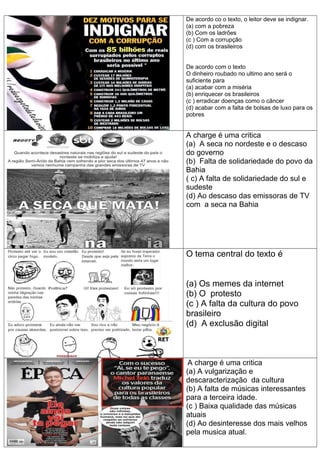 O documento contém várias charges e perguntas sobre elas. As charges criticam (1) a falta de qualificação e infraestrutura no sistema de saúde, (2) o descaso com a educação pública, e (3) a grande quantidade de impostos pagos pelos trabalhadores.