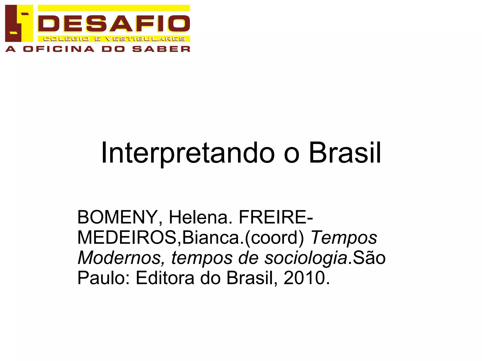 O documento discute como vários intelectuais brasileiros interpretaram a identidade nacional ao longo do tempo, observando costumes, raça, regiões e estruturas sociais. Oliveira Vianna defendia a imigração europeia para "embranquecer" o país, enquanto Monteiro Lobato e Euclides da Cunha exploraram a cultura do campo e do sertão. Sérgio Buarque de Holanda analisou como a herança portuguesa moldou a sociedade "cordial" brasileira, marcada pela informalidade e emoção