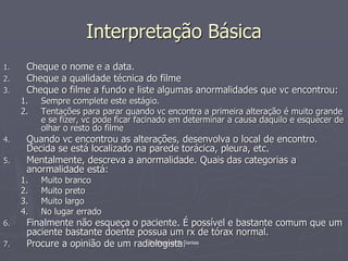 O documento é um guia para a interpretação de radiografias de tórax, com ênfase na avaliação da qualidade técnica, identificação de anormalidades e procedimentos de leitura. Dr. Emanuel R. Dantas fornece um checklist detalhado para assegurar uma análise minuciosa, incluindo a verificação de campos pulmonares, hilos, coração e mediastino. O texto também aborda a localização de lesões e distinções entre condições como derrame pleural e colapso pulmonar.
