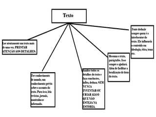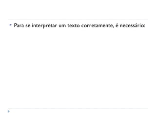 O documento discute os elementos essenciais para interpretar um texto: emissor, mensagem, receptor, código e canal. Ele aplica esses elementos para analisar uma capa da revista Veja, identificando a revista como emissora, as principais notícias como mensagens, o leitor-alvo como receptor, o uso de letras e imagens como código e a revista impressa como canal.