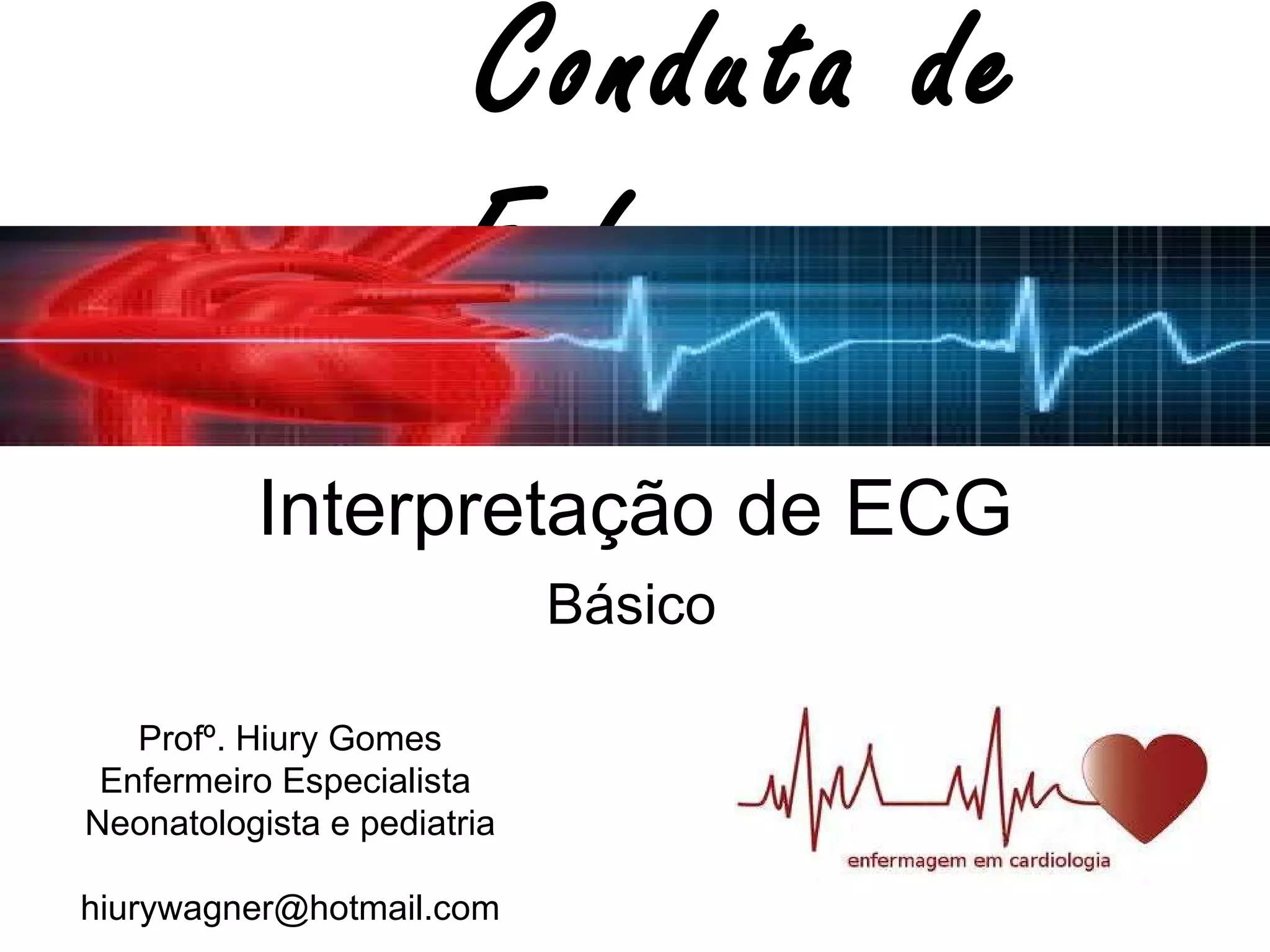 O documento apresenta um resumo sobre interpretação de ECG, descrevendo sua anatomia, posição de registro, ondas P, QRS e T, intervalos PR e RR e algumas alterações como fibrilação atrial e infarto. Fornece também referências bibliográficas sobre o tema.