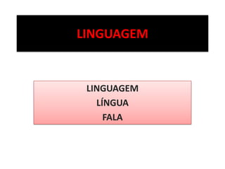 A linguagem é qualquer sistema de símbolos que os humanos usam para se comunicar. Ela inclui a língua, que é o código verbal de um grupo, e a fala, que é a utilização individual da língua por cada pessoa. A comunicação envolve um emissor, receptor, mensagem, código e canal, e pode ser verbal, não verbal ou mista.