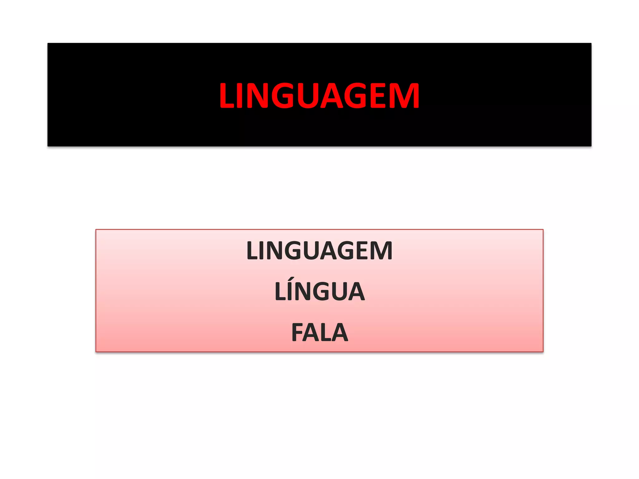 A linguagem é qualquer sistema de símbolos que os humanos usam para se comunicar. Ela inclui a língua, que é o código verbal de um grupo, e a fala, que é a utilização individual da língua por cada pessoa. A comunicação envolve um emissor, receptor, mensagem, código e canal, e pode ser verbal, não verbal ou mista.