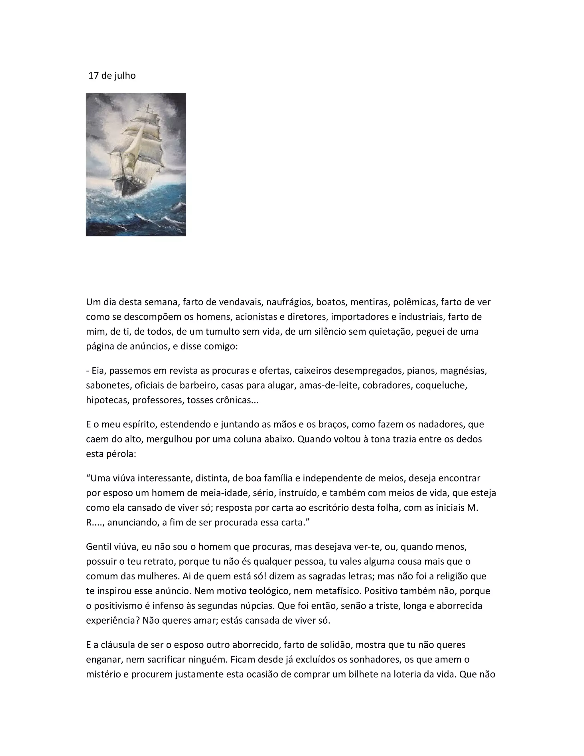 O texto descreve o anúncio de uma viúva que deseja encontrar um novo marido. Ela busca alguém sério, instruído e também com recursos financeiros, que esteja cansado de viver sozinho, assim como ela. O cronista reflete sobre o anúncio e acredita que o que a viúva realmente procura é um remédio para o tédio da solidão, e não necessariamente um companheiro.