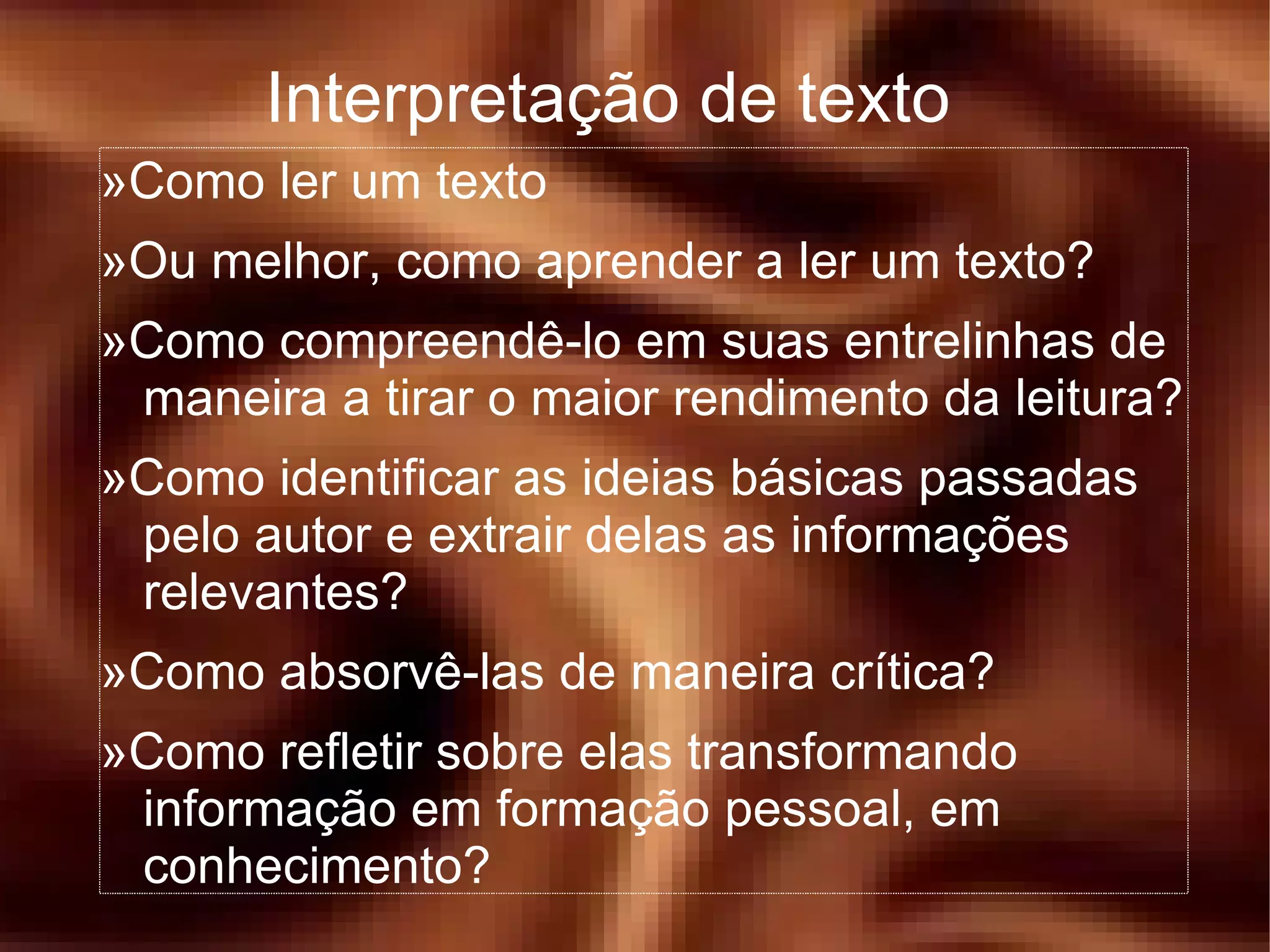 O documento discute como ler e interpretar textos de forma crítica, identificando ideias-chave e compreendendo o contexto e função do texto. Explica que um texto só faz sentido quando há coerência lógica e coesão entre suas partes. Detalha três passos para interpretação: análise do assunto e intenção, identificação de ideias-núcleo e compreensão de níveis de leitura.