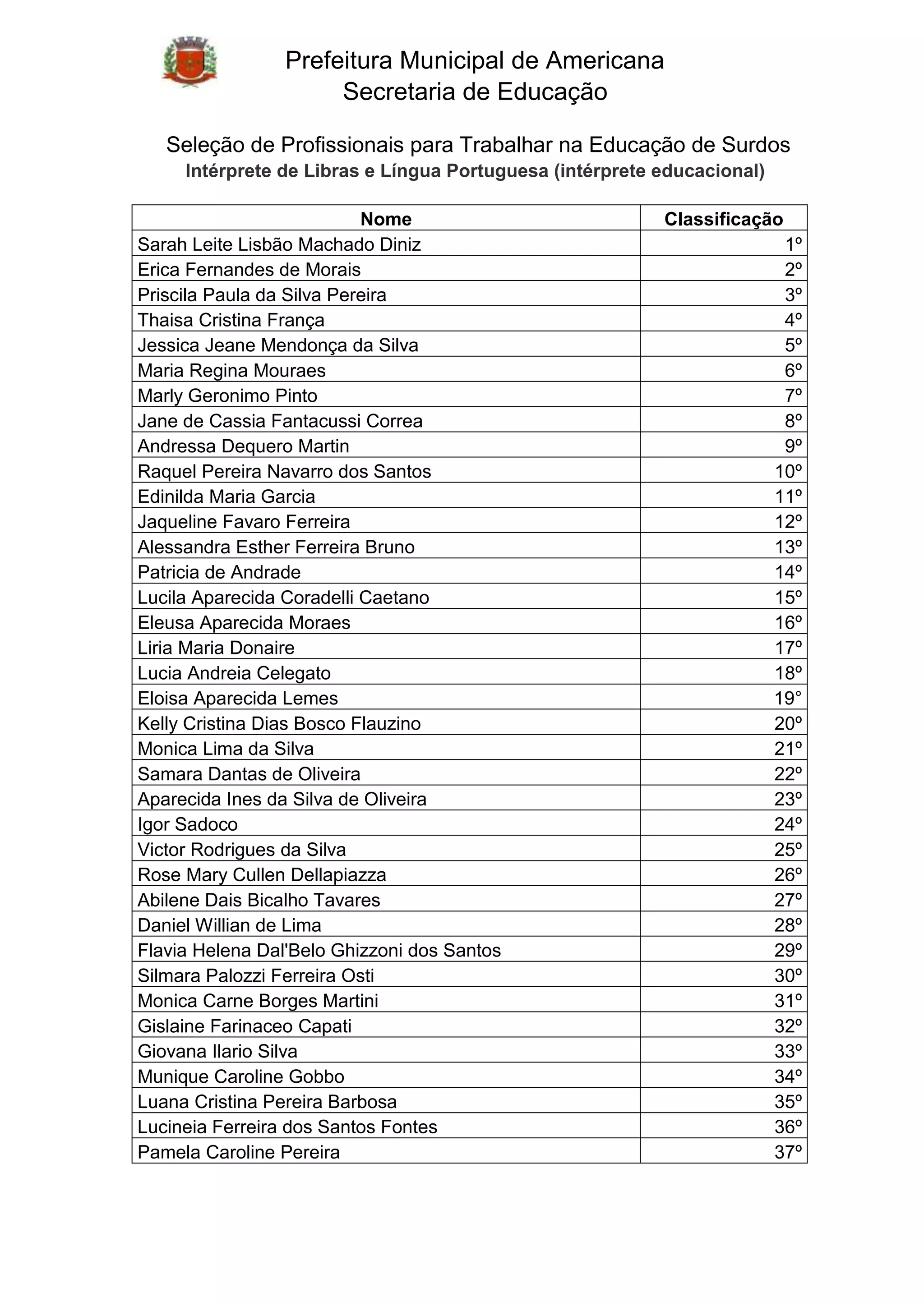Este documento lista os nomes de 37 profissionais classificados em uma seleção para trabalhar como intérpretes de Libras e Língua Portuguesa em uma prefeitura municipal. A primeira colocada foi Sarah Leite Lisbão Machado Diniz e a última foi Lucineia Ferreira dos Santos Fontes.