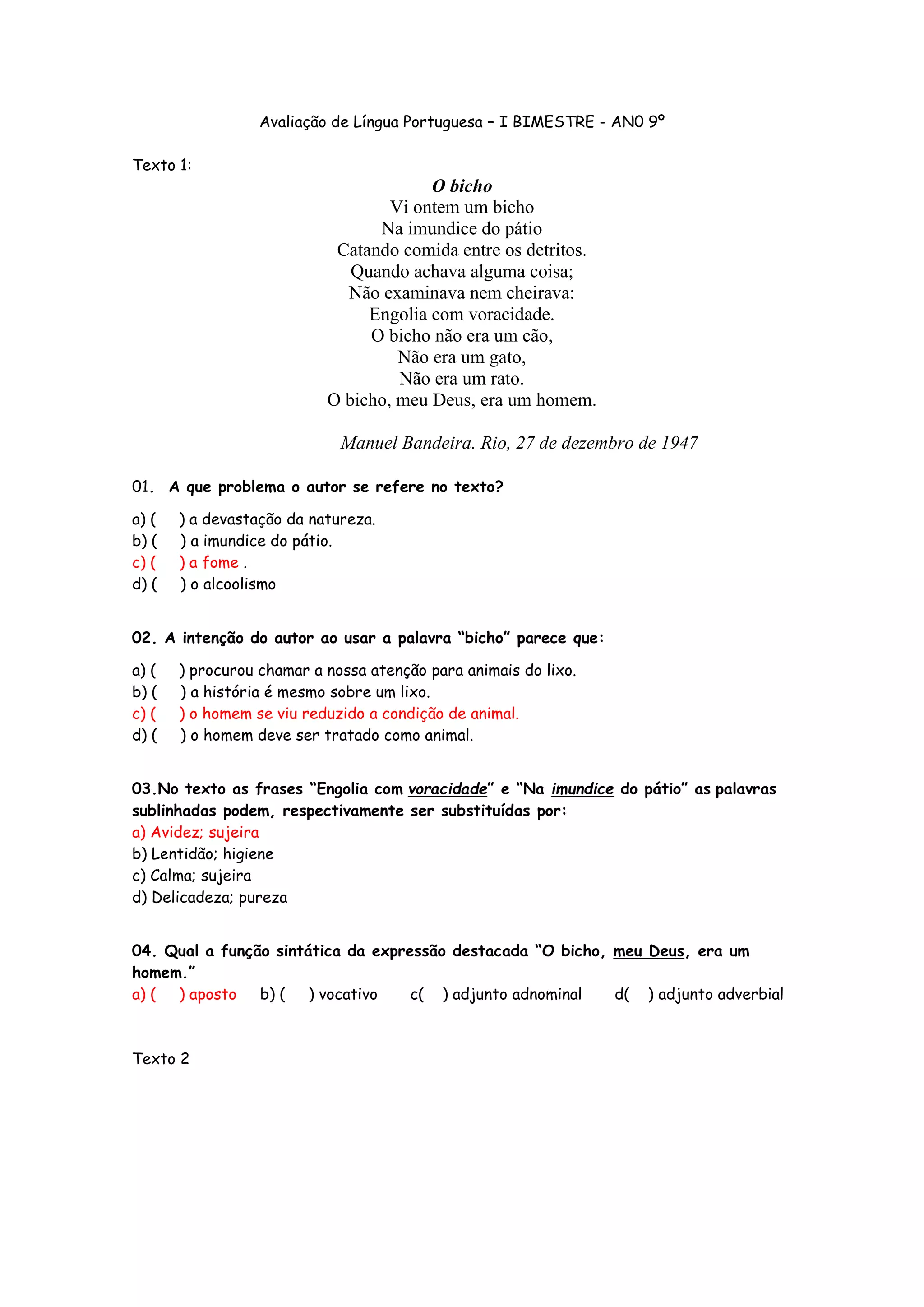 O documento apresenta questões sobre três textos diferentes. O texto 1 trata da fome e da condição desumana vivida por um homem. O texto 2 descreve as ações cotidianas de uma pessoa. O texto 3 discute desculpas comuns usadas por adolescentes para justificar atrasos e sugere alternativas mais criativas.