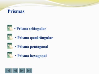 O documento descreve métodos para determinar a intersecção de um prisma com diferentes planos, traçando segmentos paralelos às arestas do prisma. As etapas incluem traçar segmentos paralelos passando por pontos de intersecção com o plano para definir a forma poligonal resultante.
