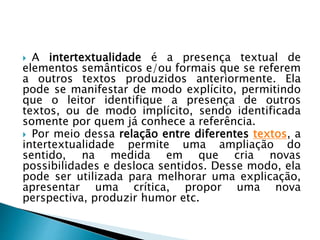 O documento discute os diferentes tipos de intertextualidade que podem ocorrer em uma nova produção textual, como citações, paródias, paráfrases e epígrafes. A intertextualidade pode ser explícita, quando há referências diretas ao texto original, ou implícita, quando o leitor precisa conhecer a referência para identificar a relação entre os textos. A intertextualidade permite ampliar os sentidos de um texto ao criar novas possibilidades através da relação com produções textuais anteriores.