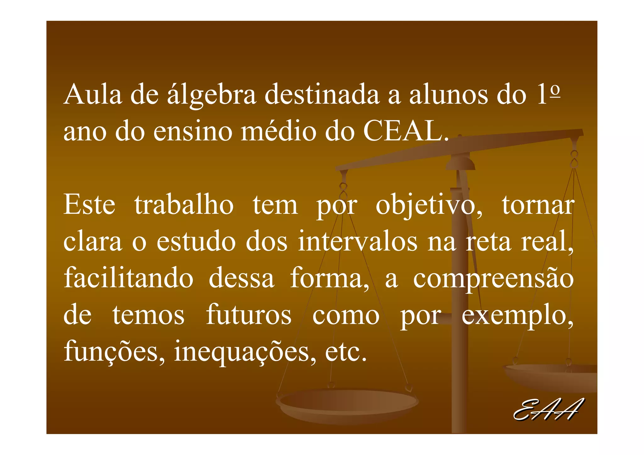 Este documento apresenta os conceitos básicos de intervalos numéricos na reta real. Explica que intervalos são subconjuntos de números reais determinados por desigualdades e apresenta os tipos de intervalos: fechado, aberto, fechado à direita/esquerda. Também mostra como determinar quais números inteiros pertencem a cada intervalo.