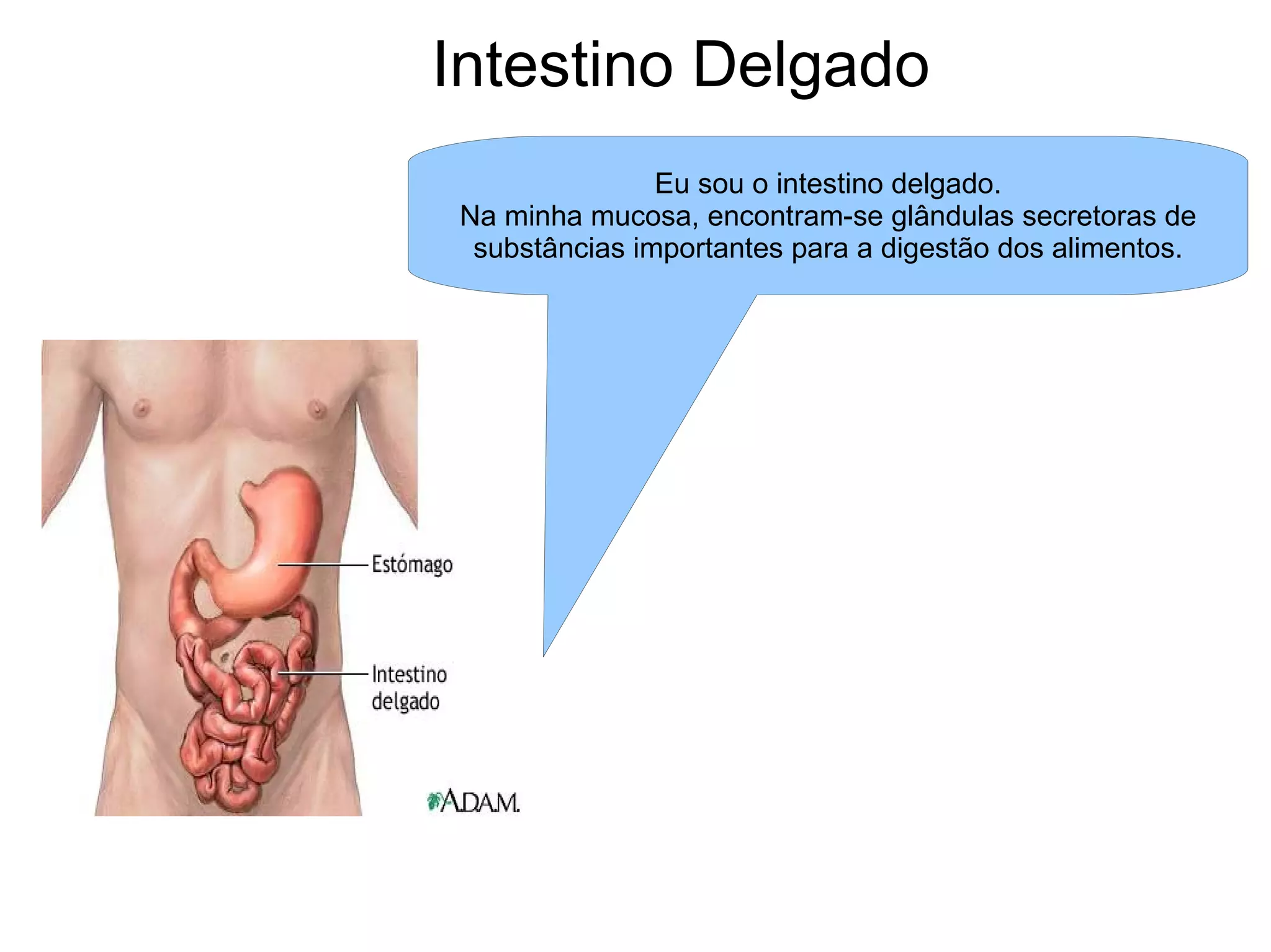 O intestino delgado secreta substâncias importantes para a digestão, possui vilosidades e microvilosidades que aumentam a área de absorção de nutrientes, e vasos linfáticos transportam os nutrientes absorvidos para o corpo.