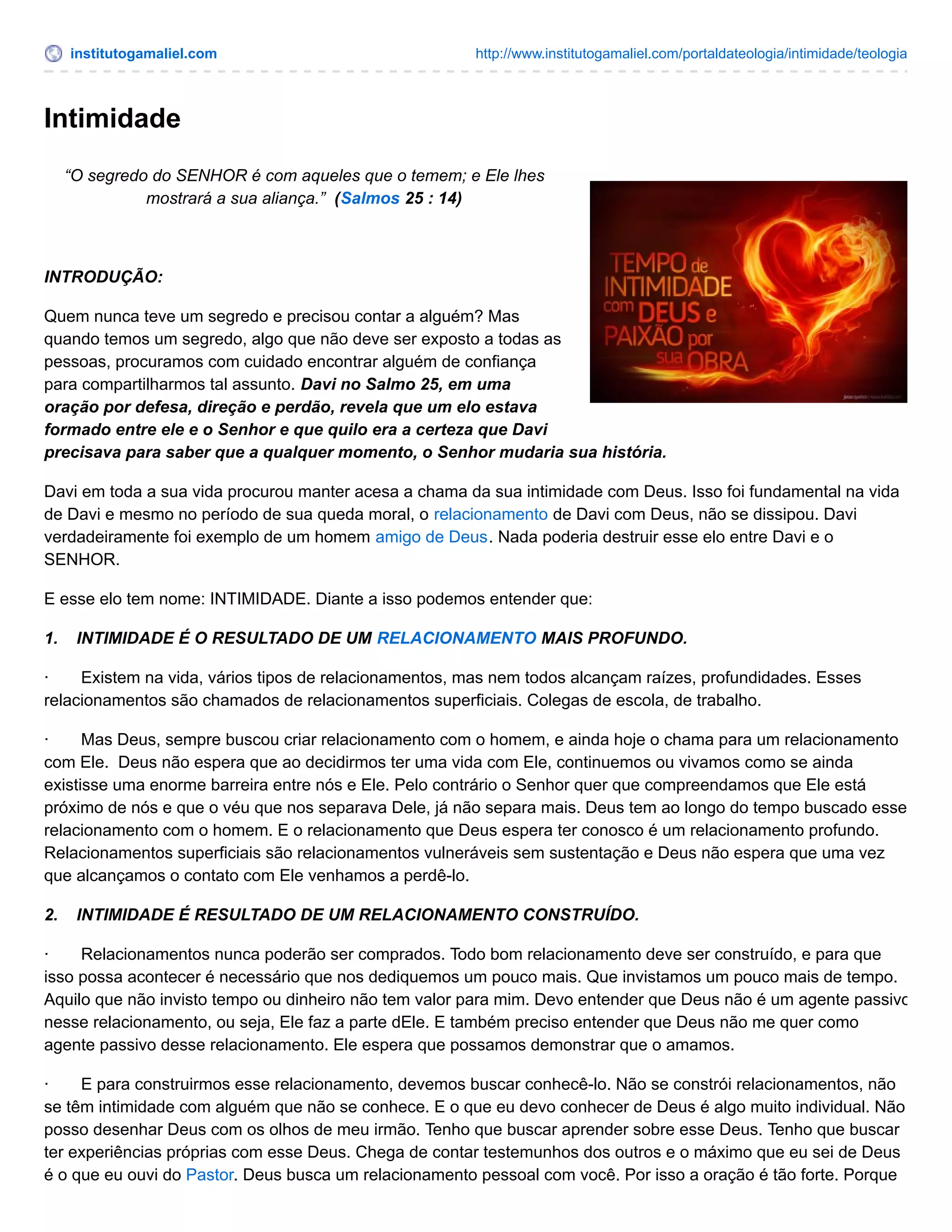 Este documento discute a intimidade com Deus. Afirma que a intimidade é resultado de um relacionamento mais profundo construído ao longo do tempo com Deus, através do conhecimento de Deus e da confiança nele. Davi é citado como exemplo de alguém que manteve uma relação íntima com Deus mesmo nos momentos de queda.