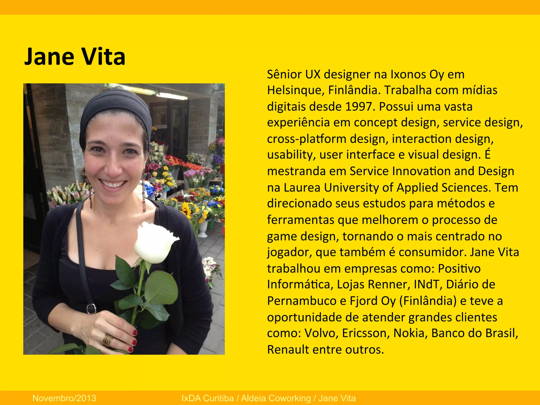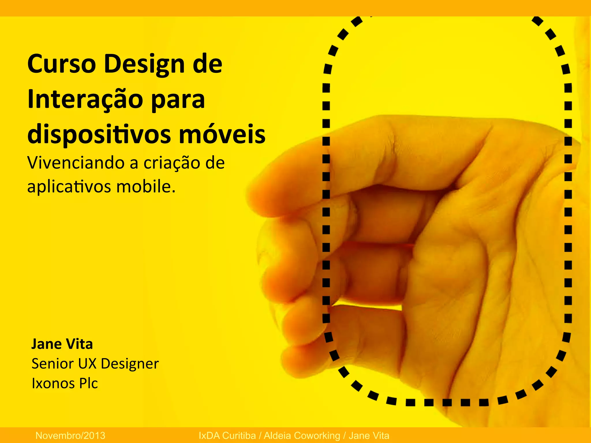Este documento fornece informações sobre um workshop sobre design de interação para dispositivos móveis ministrado por Jane Vita. O workshop abordará tópicos como iniciando o processo de criação para aplicativos móveis, pesquisas de usuários, escolha de tecnologia e uma sessão prática. O objetivo é ensinar os participantes a criar aplicativos mobile centrados no usuário.