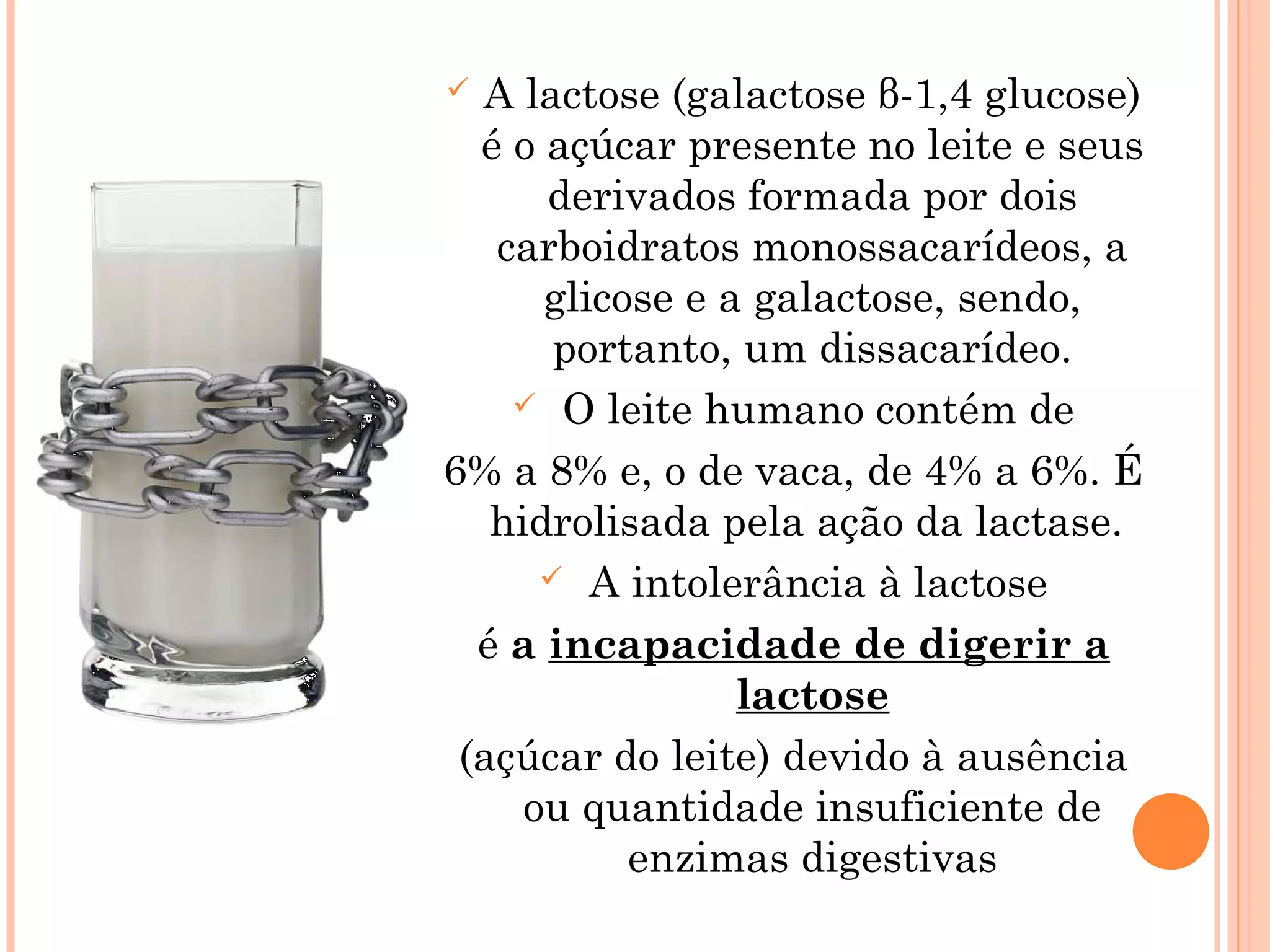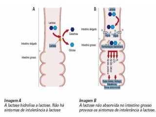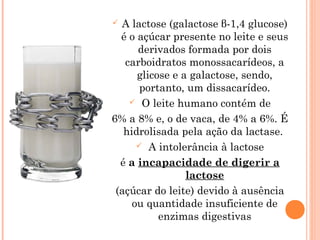 O documento discute a intolerância à lactose, especificamente: (1) A lactose é o açúcar do leite que requer a enzima lactase para ser digerida; (2) A intolerância à lactose ocorre quando há deficiência de lactase, levando a sintomas; (3) Existem opções de tratamento como evitar produtos lácteos ou consumir produtos fermentados ou com baixo teor de lactose.