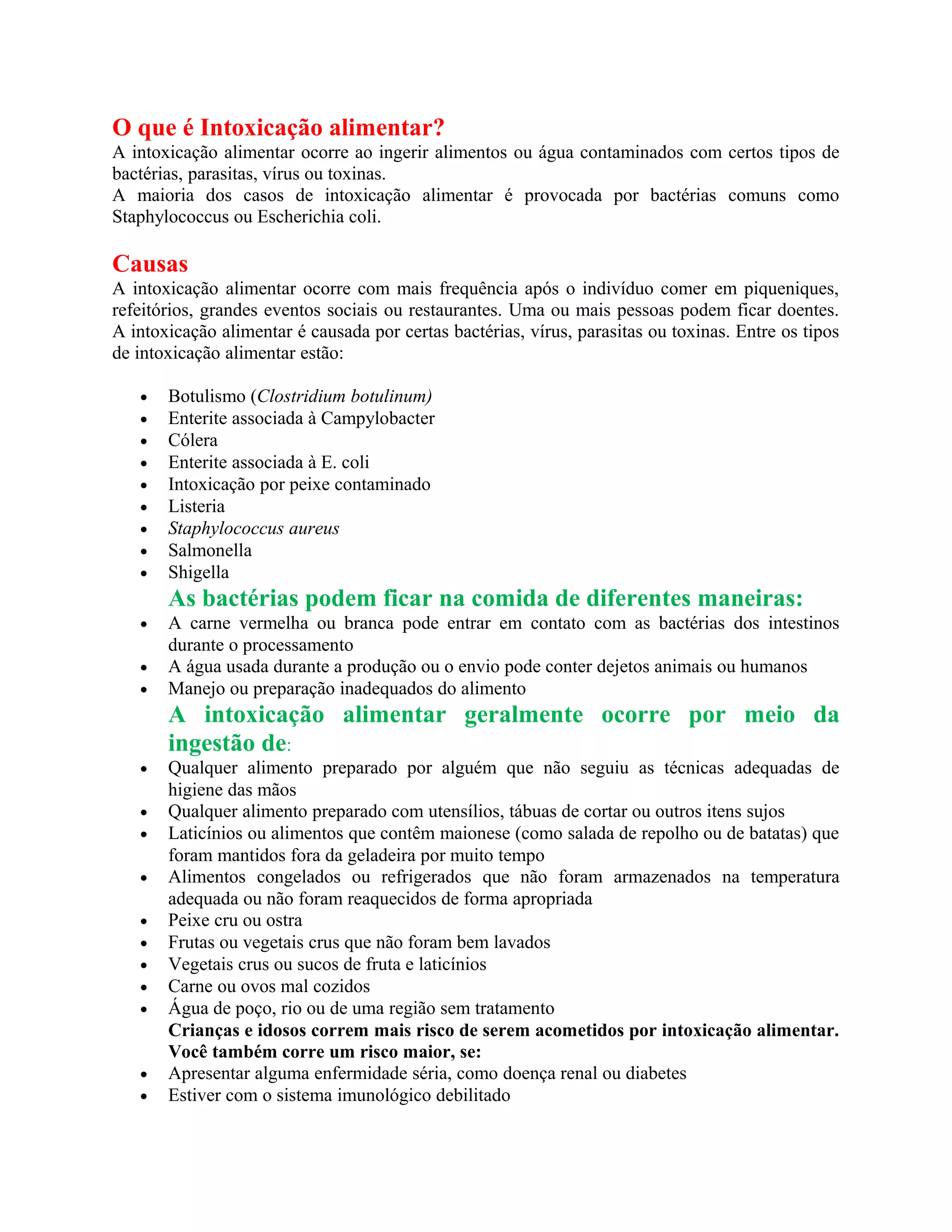 A intoxicação alimentar ocorre quando bactérias, vírus ou toxinas contaminam alimentos ingeridos. Isso causa sintomas como diarreia, vômito e dor abdominal. O tratamento envolve repouso, ingestão de líquidos e em casos graves, hidratação intravenosa. A prevenção inclui boas práticas de higiene e preparo seguro dos alimentos.