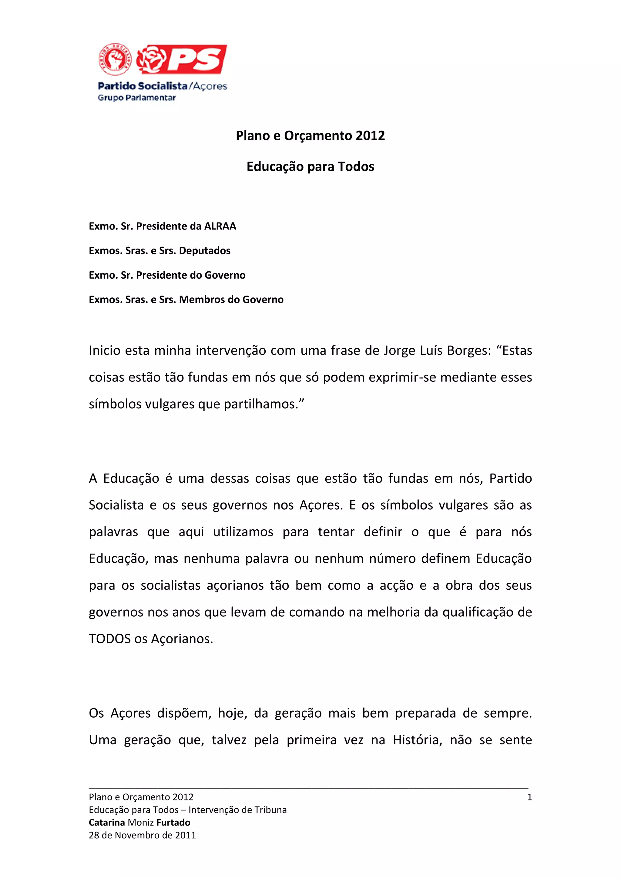 1) O documento discute o plano e orçamento de 2012 para educação para todos nos Açores.