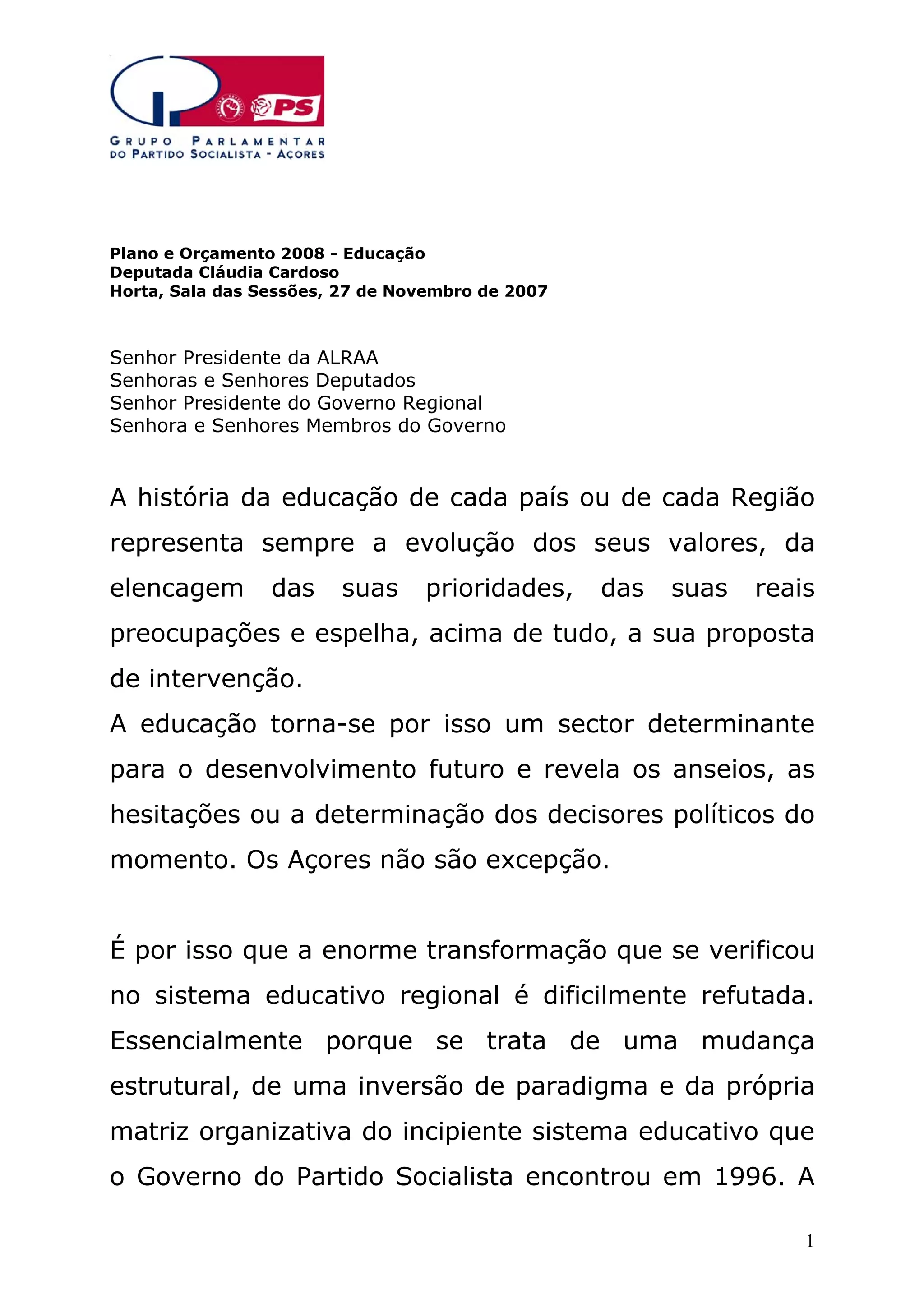 [1] O documento discute o Plano e Orçamento para 2008 da Educação nos Açores, destacando as conquistas alcançadas pelos governos do Partido Socialista nos últimos 10 anos, como a melhoria das infraestruturas escolares, o aumento da qualidade do ensino e a redução das taxas de insucesso e retenção escolar. [2] A oposição do PSD é criticada, já que anunciou voto contra os documentos apesar de poder apresentar propostas de alteração. [3] O investimento no ensino profissional e nas tecn