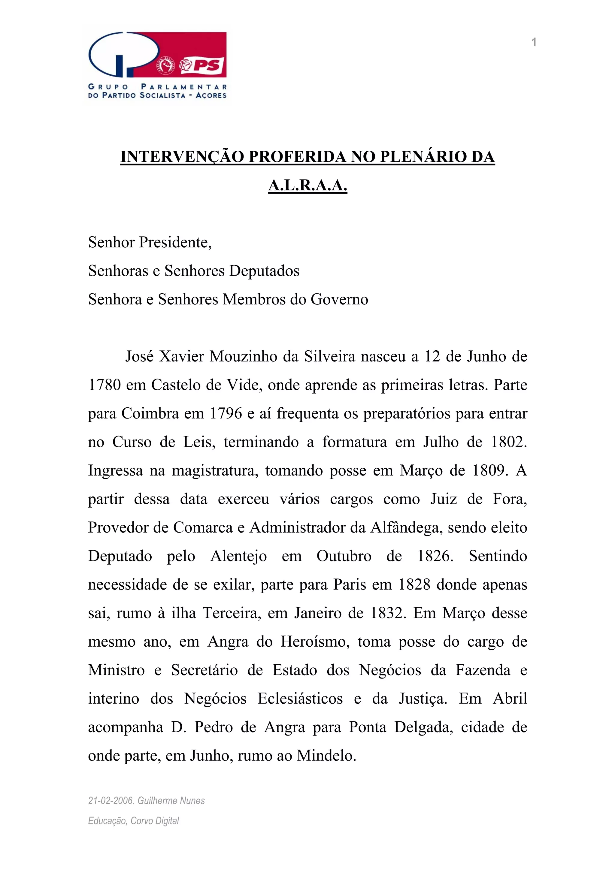 [1] O documento descreve a vida e carreira de José Xavier Mouzinho da Silveira, um político português do século XIX que melhorou as condições de vida na ilha de Corvo através de decretos promulgados em 1832. [2] O documento também descreve investimentos recentes na escola da ilha de Corvo, agora chamada Escola Básica Integrada Mouzinho da Silveira, incluindo computadores para todos os alunos e professores e acesso gratuito à internet através do projeto "Corvo