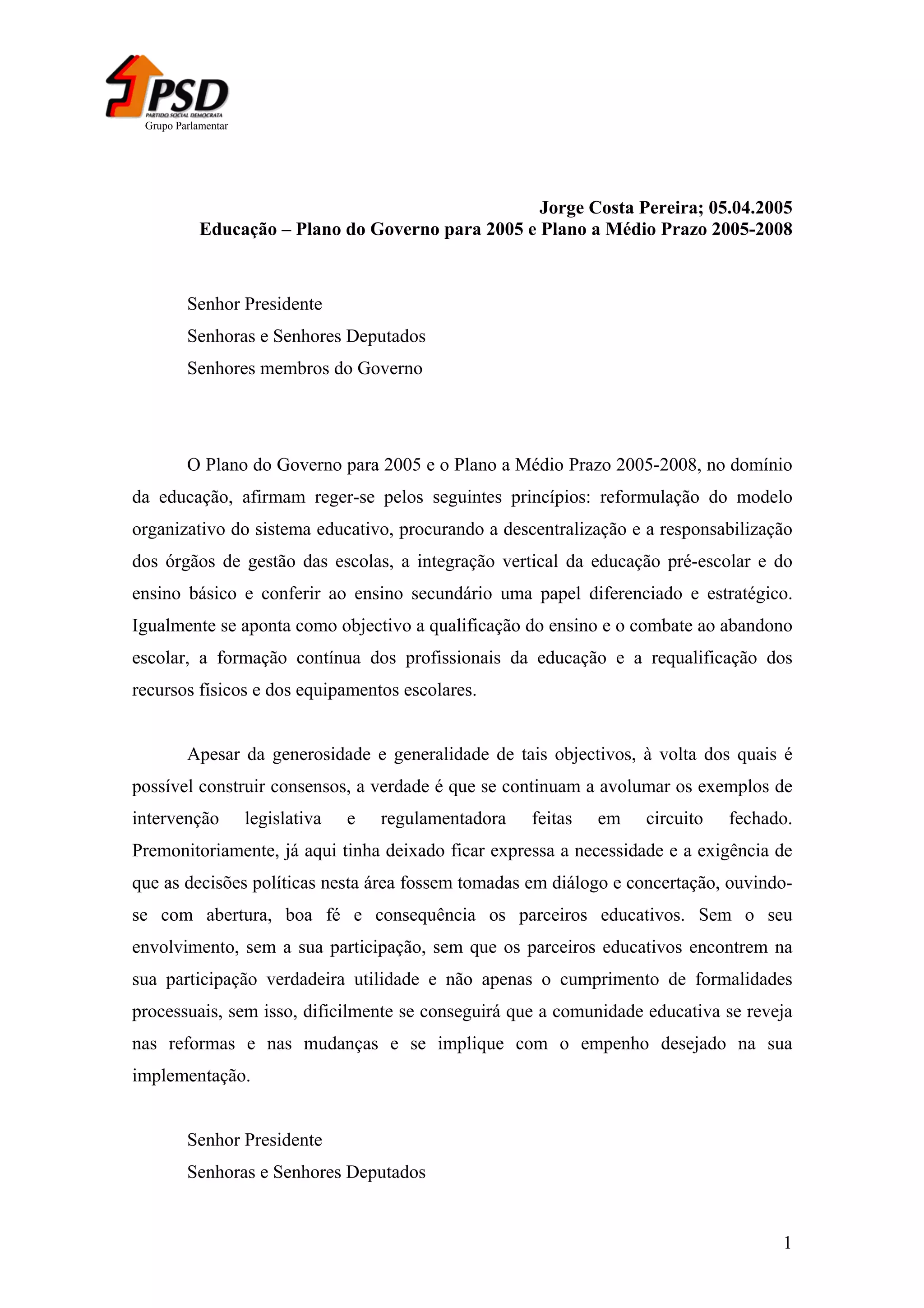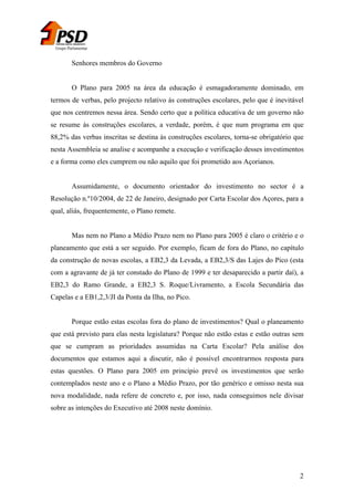 O documento discute os planos do governo regional para a educação em 2005 e entre 2005-2008. Critica a falta de detalhes nos planos, especialmente no plano de médio prazo, e questiona porque certas escolas não estão incluídas. Também aponta atrasos no cumprimento de promessas antigas e inconsistências entre os planos e a Carta Escolar. Pede maior rigor, transparência e compromisso do governo com os planos apresentados à Assembleia Regional.