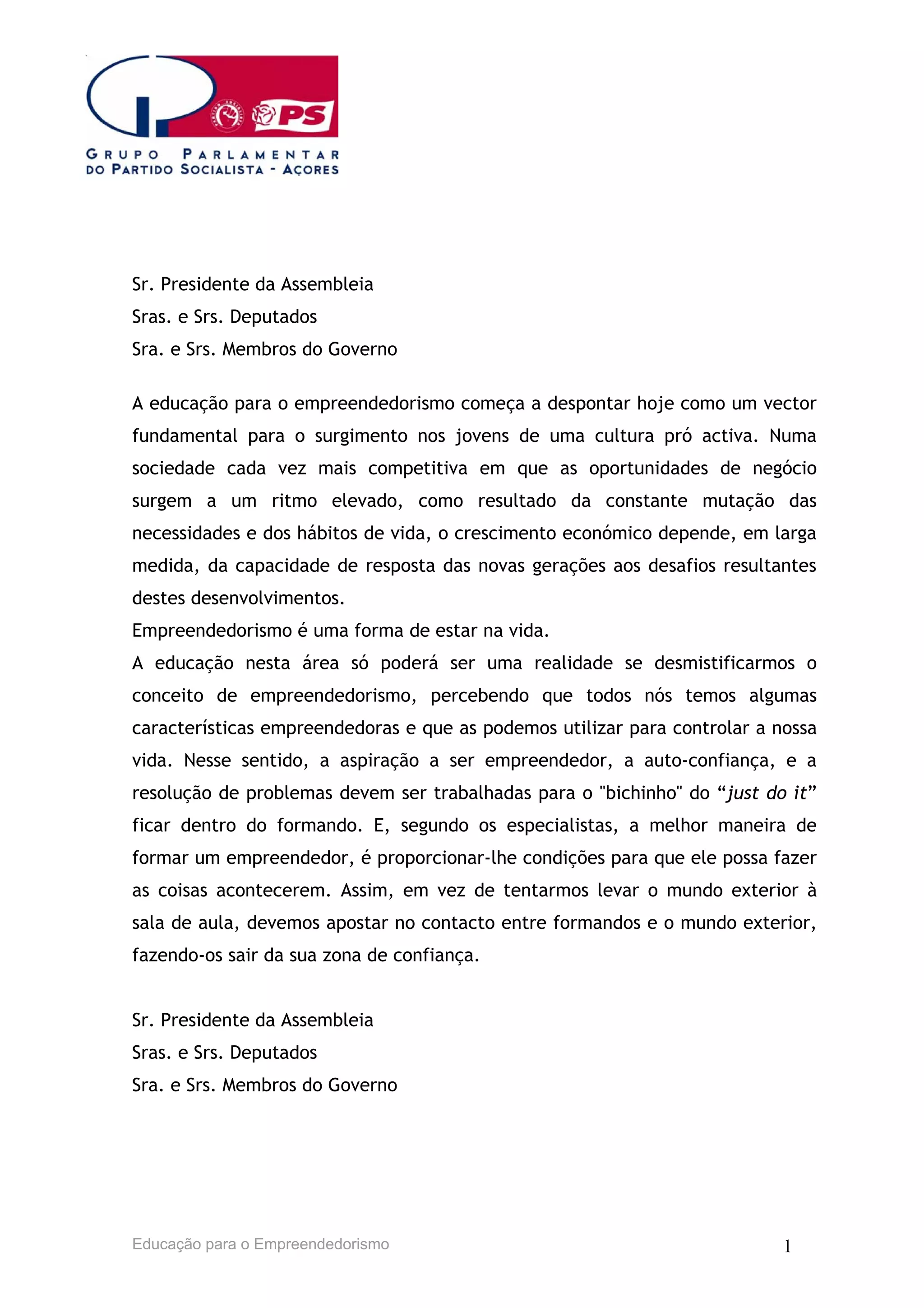 1. O documento defende a educação para o empreendedorismo como fundamental para desenvolver uma cultura pró-ativa nos jovens.