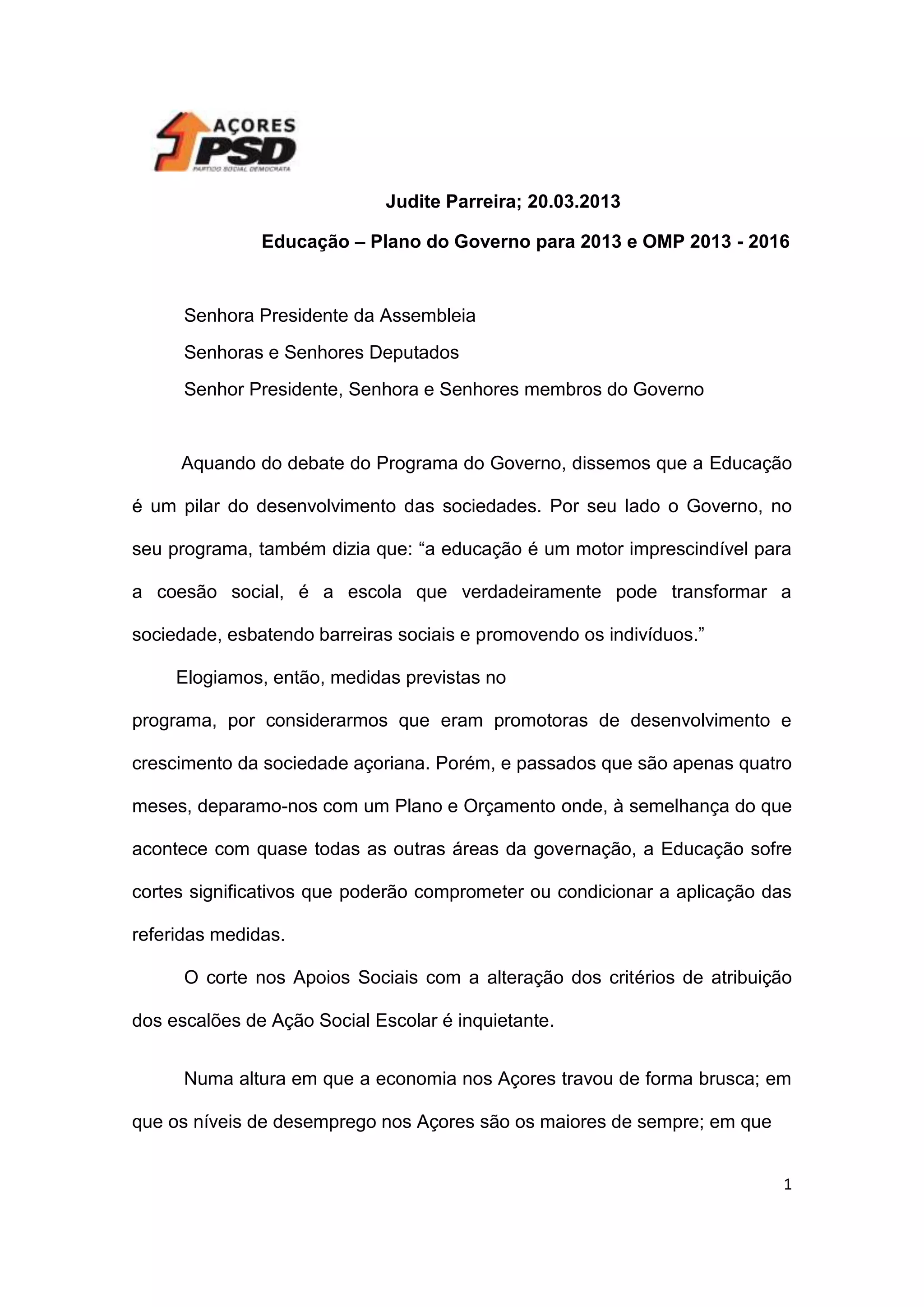 O documento discute o plano do governo para a educação em 2013 e o orçamento para 2013-2016. Critica cortes significativos nos apoios sociais escolares e na formação de professores, argumentando que isso pode comprometer o sucesso escolar e a igualdade de oportunidades. Defende que estratégias de construção de grandes escolas não resolveram problemas e pede justificação para a remoção de escolas de planos anteriores.