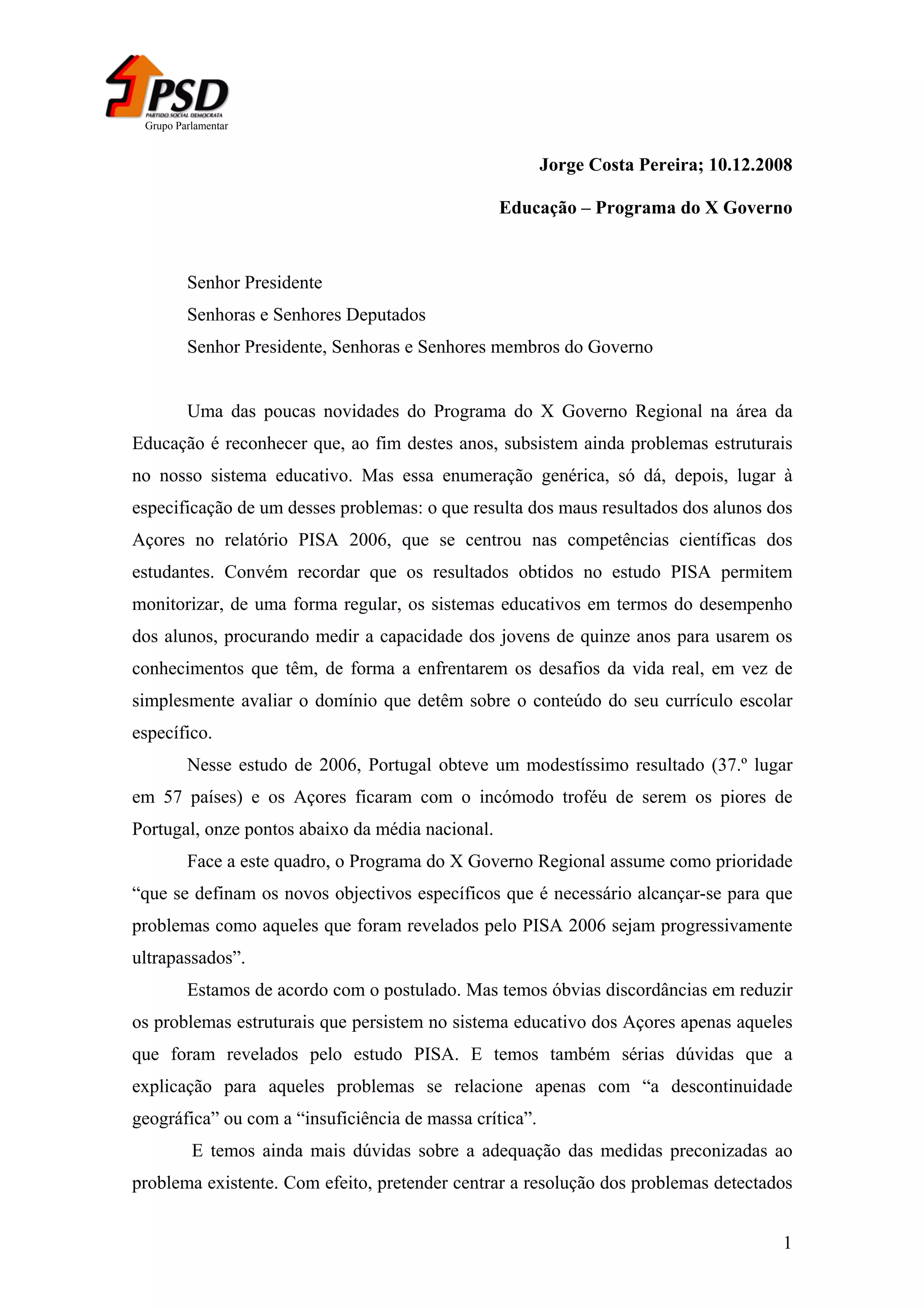 O documento resume as críticas de Jorge Costa Pereira ao programa do governo regional na área da educação. Ele aponta que o programa reconhece problemas estruturais no sistema educativo, mas foca demais nos resultados do PISA ao invés de outros problemas. Além disso, as medidas propostas não abordam as causas fundamentais dos problemas e ignoram questões como a implementação dos itinerários da educação básica e a desmotivação dos professores.