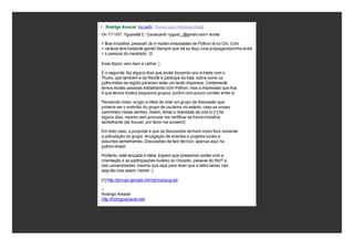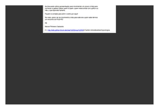 Este documento apresenta a história e objetivos do grupo PUG-PE (Python User Group Pernambuco). Apresenta os fundadores do grupo e explica porque gostam tanto da linguagem Python. Discute a importância das comunidades de software livre e o futuro do PUG-PE, incluindo incentivar novas comunidades Python e sediar uma conferência PythonBrasil em Recife.
