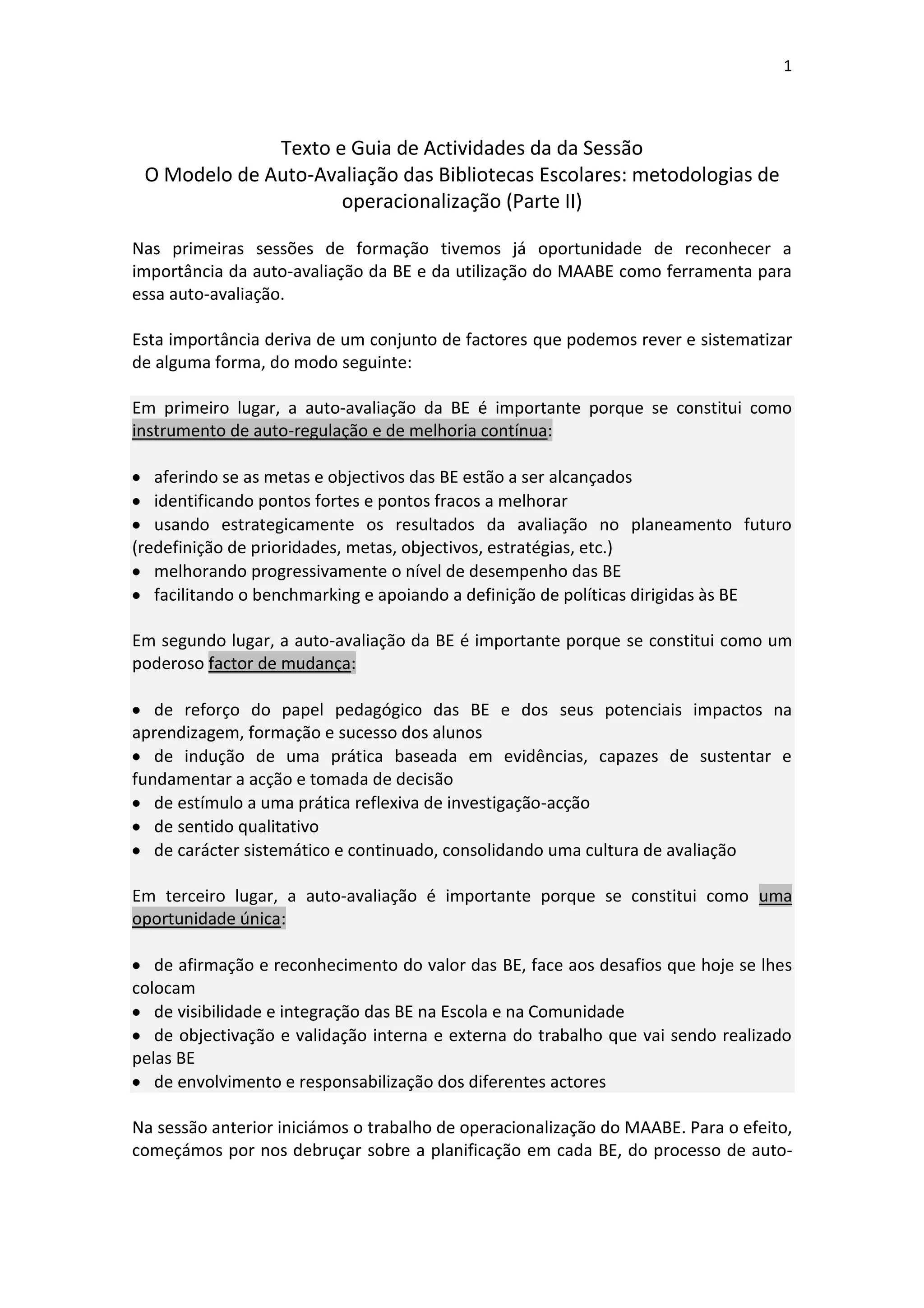 1) O documento discute a importância da auto-avaliação de bibliotecas escolares e fornece orientações sobre como implementar o Modelo de Auto-Avaliação de Bibliotecas Escolares (MAABE).
