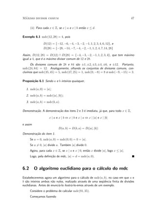 1) O documento discute o conceito e propriedades do máximo divisor comum (mdc) de dois inteiros;