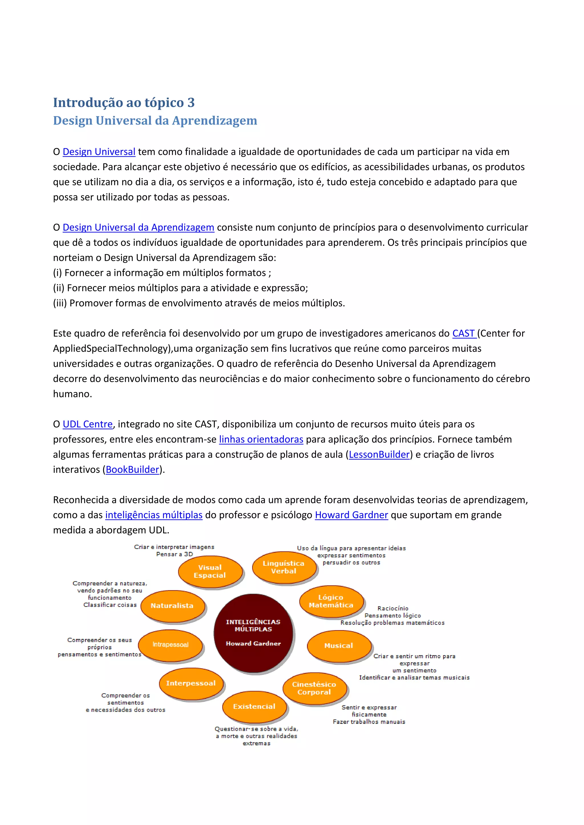 O Design Universal da Aprendizagem visa promover a igualdade de oportunidades na educação através de três princípios: fornecer informação em múltiplos formatos, fornecer meios múltiplos para atividade e expressão, e promover formas de envolvimento através de meios múltiplos. Este modelo foi desenvolvido por pesquisadores americanos e se baseia no conhecimento sobre o funcionamento do cérebro humano.