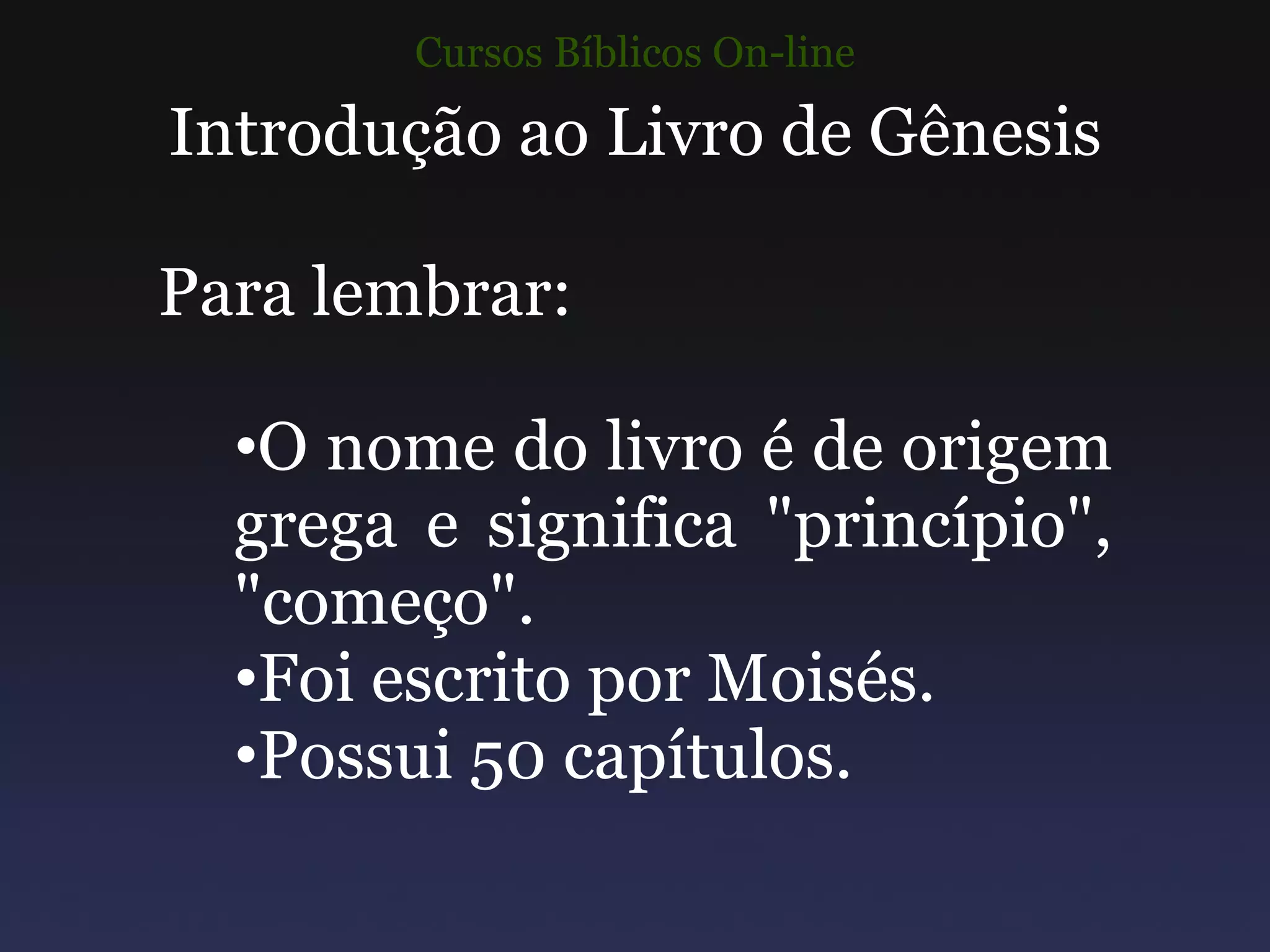 O livro de Gênesis foi escrito por Moisés e divide-se em três partes, da Criação aos patriarcas, dos patriarcas a José e de José até sua morte, introduzindo os primeiros onze capítulos da Bíblia e contando histórias dos patriarcas como Abraão e José.