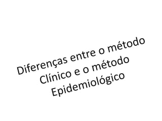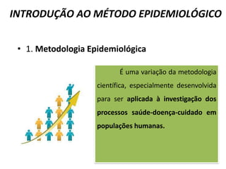 O documento introduz conceitos fundamentais do método epidemiológico, incluindo: (1) a epidemiologia como uma variação da metodologia científica aplicada à saúde de populações humanas; (2) o problema epidemiológico como surgindo quando doenças acometem grupos humanos, exigindo a remoção de fatores ambientais, culturais ou sociais nocivos; (3) as variáveis epidemiológicas como categorias que descrevem mudanças nos fenômenos de saúde, podendo ser qualitativas ou quantitativas