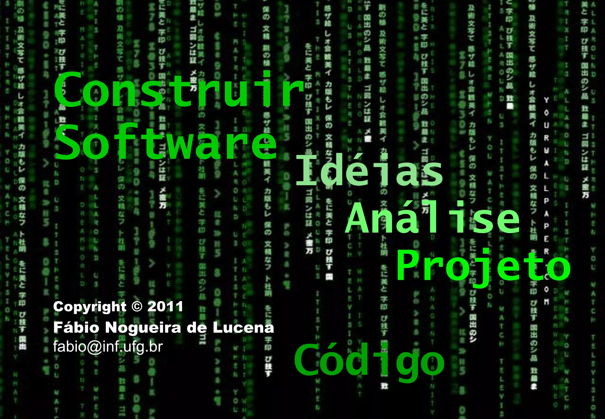 O documento discute os principais aspectos da engenharia de software, incluindo as atividades de análise, projeto e codificação necessárias para a construção de uma solução computacional. Também aborda os problemas comuns no desenvolvimento de software e a importância da qualidade e dos processos para entregar software que atenda às necessidades dos usuários.