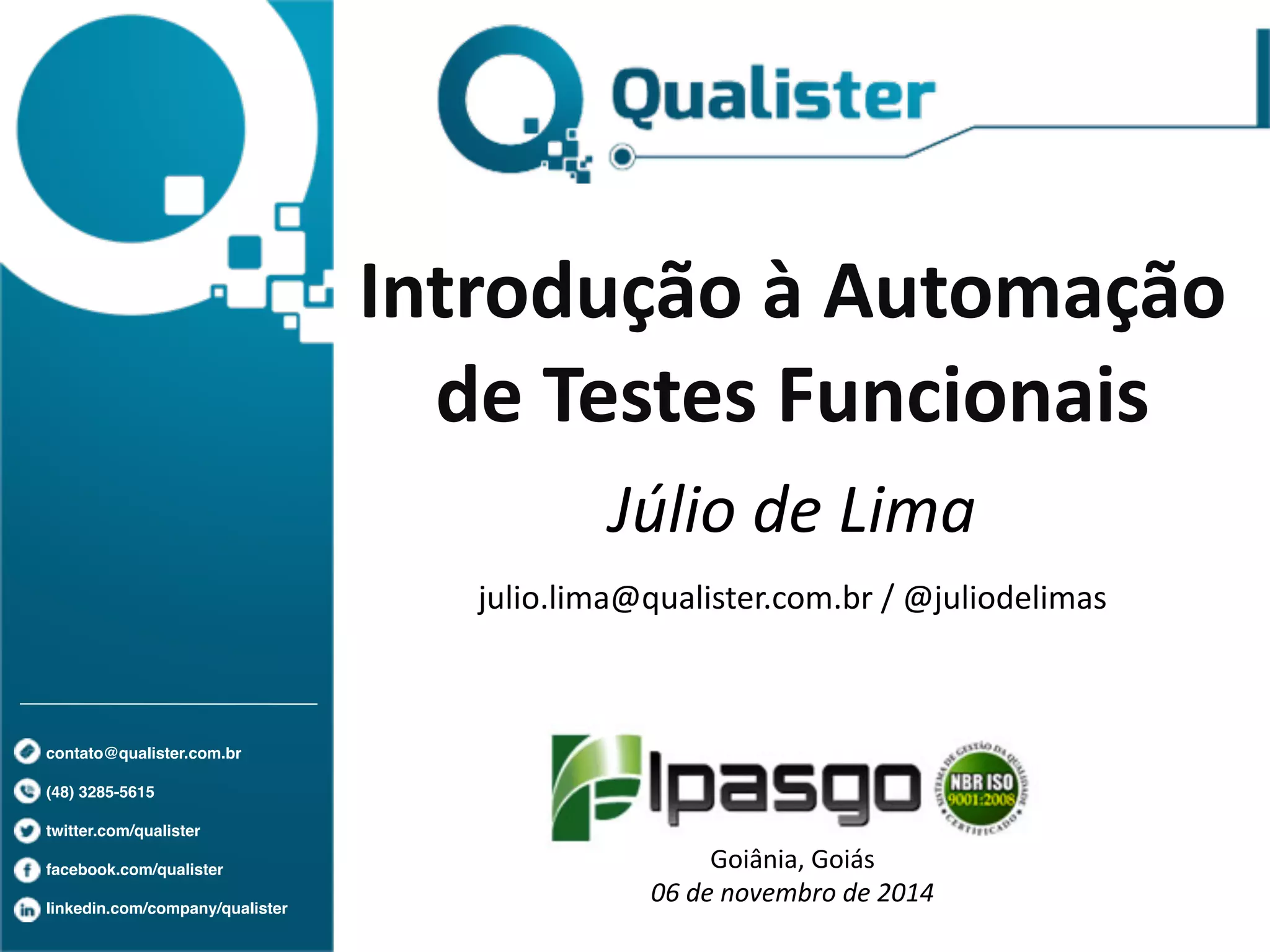 O documento apresenta uma introdução à automação de testes funcionais, destacando sua importância e comparando com testes não funcionais. São abordadas ferramentas de automação, exemplos de scripts e estratégias de teste baseadas em riscos. A Qualister, fundada em 2007, oferece cursos e tem uma ampla base de clientes e alunos formados.