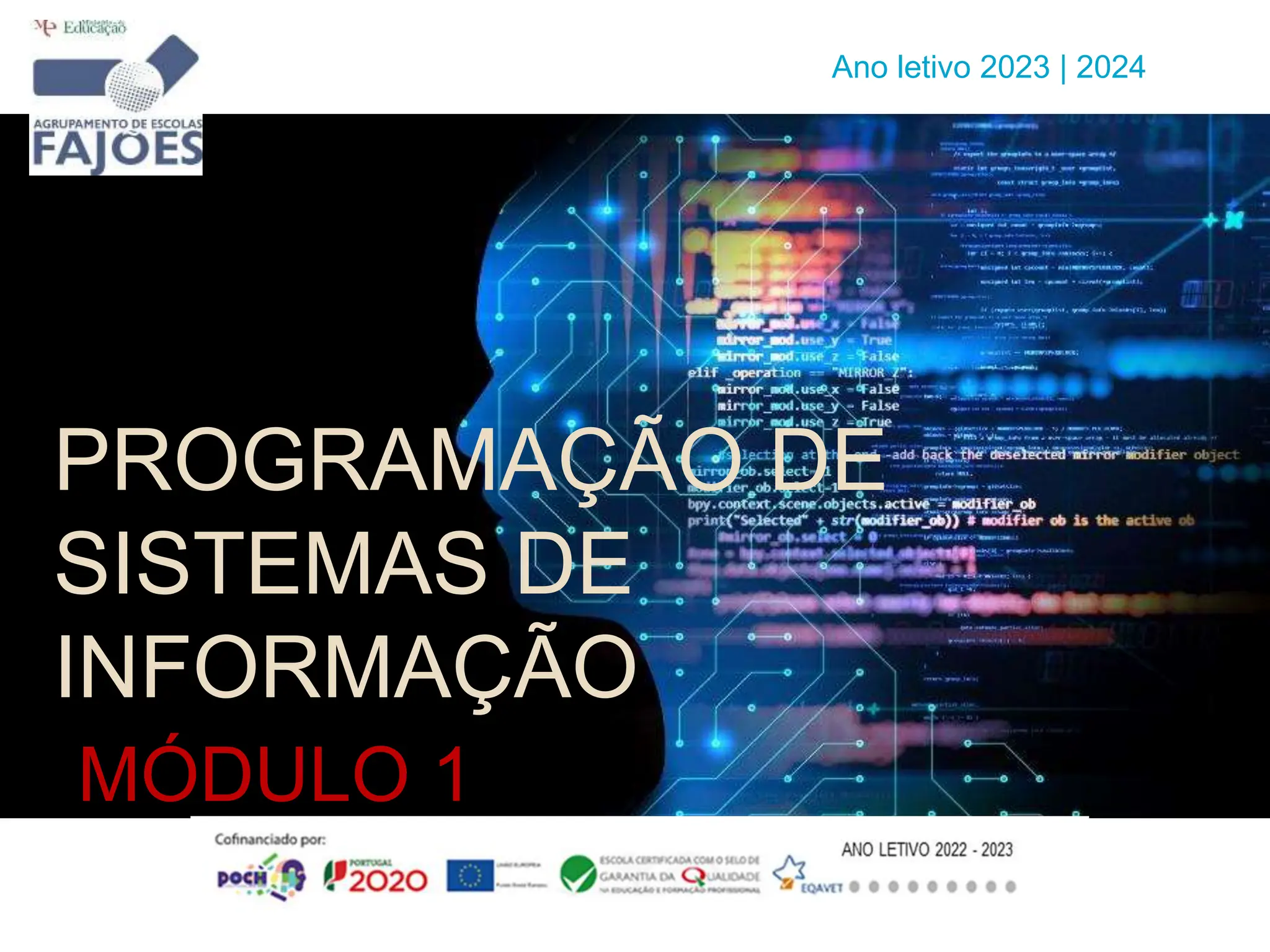 O documento apresenta a programação do módulo 1 de Sistemas de Informação para o ano letivo 2023/2024, abordando conceitos de lógica de programação, algoritmos e etapas do desenvolvimento de software. Destaca a importância de sequências lógicas e instruções na resolução de problemas, além de discutir variáveis, operadores e estruturas de decisão. O conteúdo inclui exercícios práticos e exemplos de algoritmos em pseudocódigo e fluxogramas.