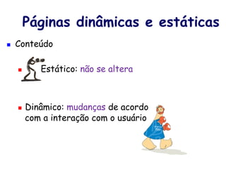 O documento descreve a história da Internet e da World Wide Web, como o HTTP e o HTML permitem a comunicação entre clientes e servidores, e algumas tecnologias que permitem criar páginas dinâmicas, como CGI, APIs e scripts do lado do servidor.