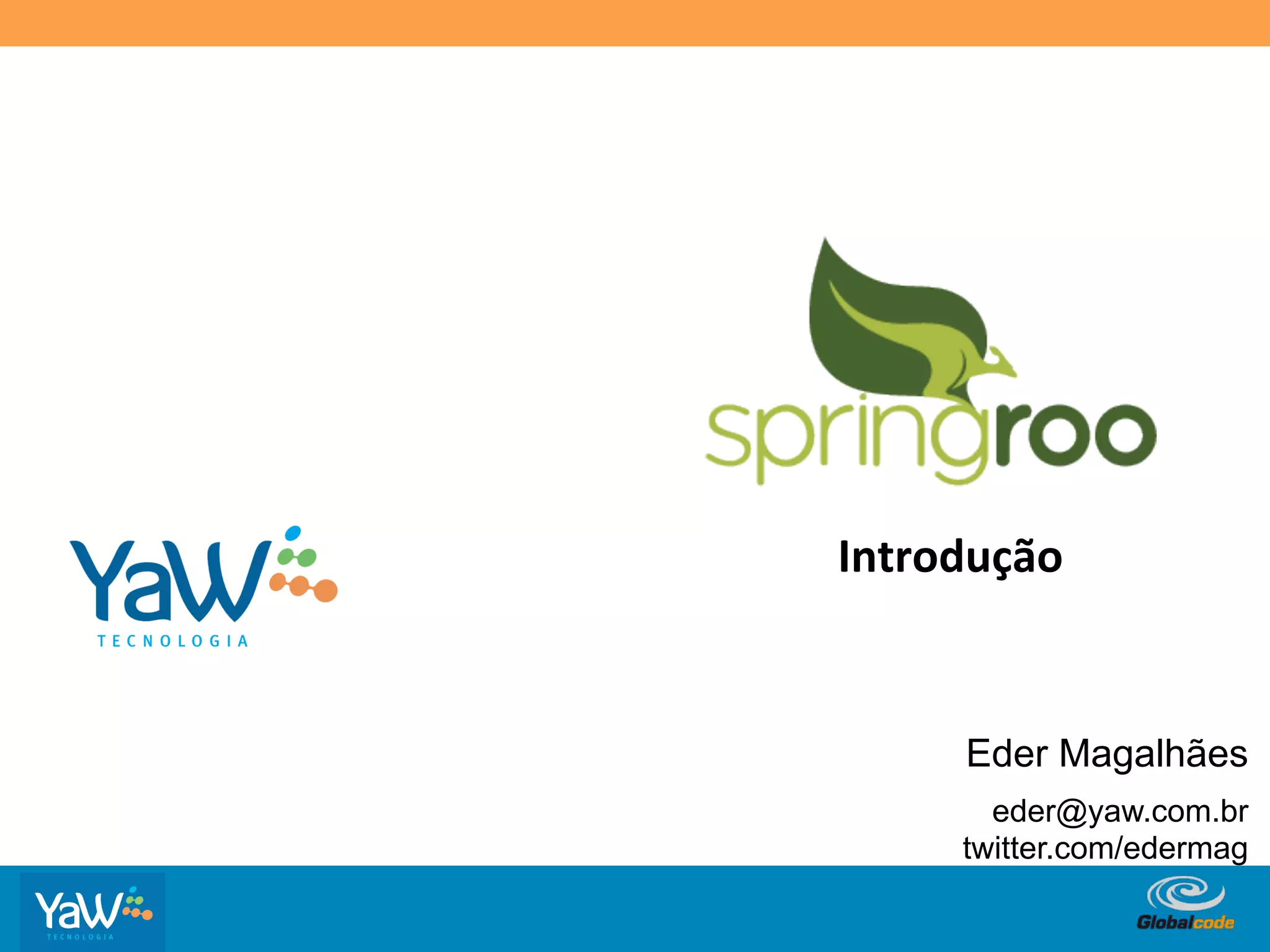 O documento apresenta o Spring Roo, uma ferramenta RAD para criação de aplicações Java. O Spring Roo aumenta a produtividade, elimina burocracia de projetos Java, e gera código de qualidade adotando padrões da comunidade Java. Ele permite criar rapidamente um projeto com estrutura de pastas, configuração do Maven, definição da camada de persistência e geração de entidades, atributos e controladores.