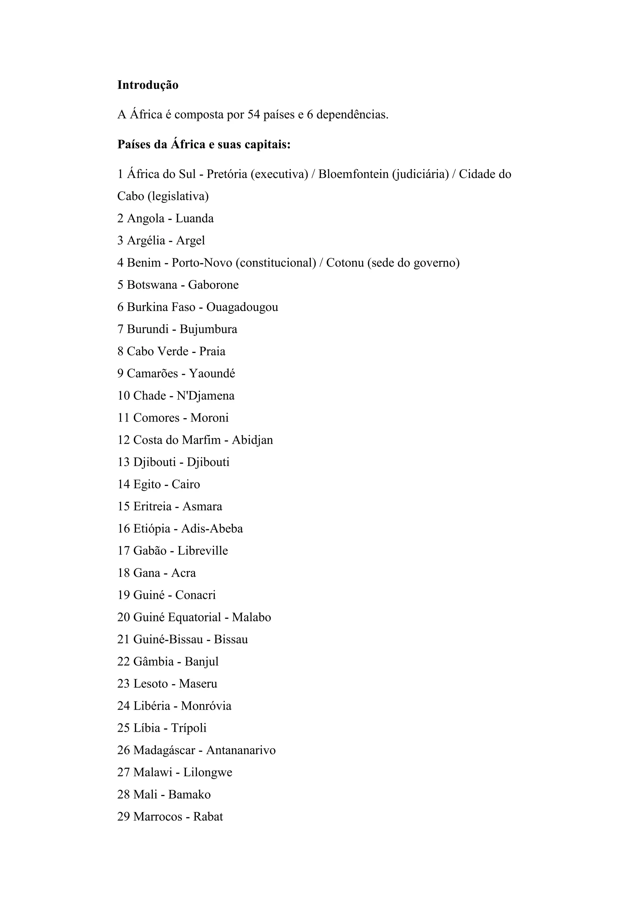 Este documento lista as 54 nações da África e suas respectivas capitais. Ele fornece o nome de cada país africano e sua capital associada em uma lista numerada, começando pela África do Sul e terminando com o Zimbábue.