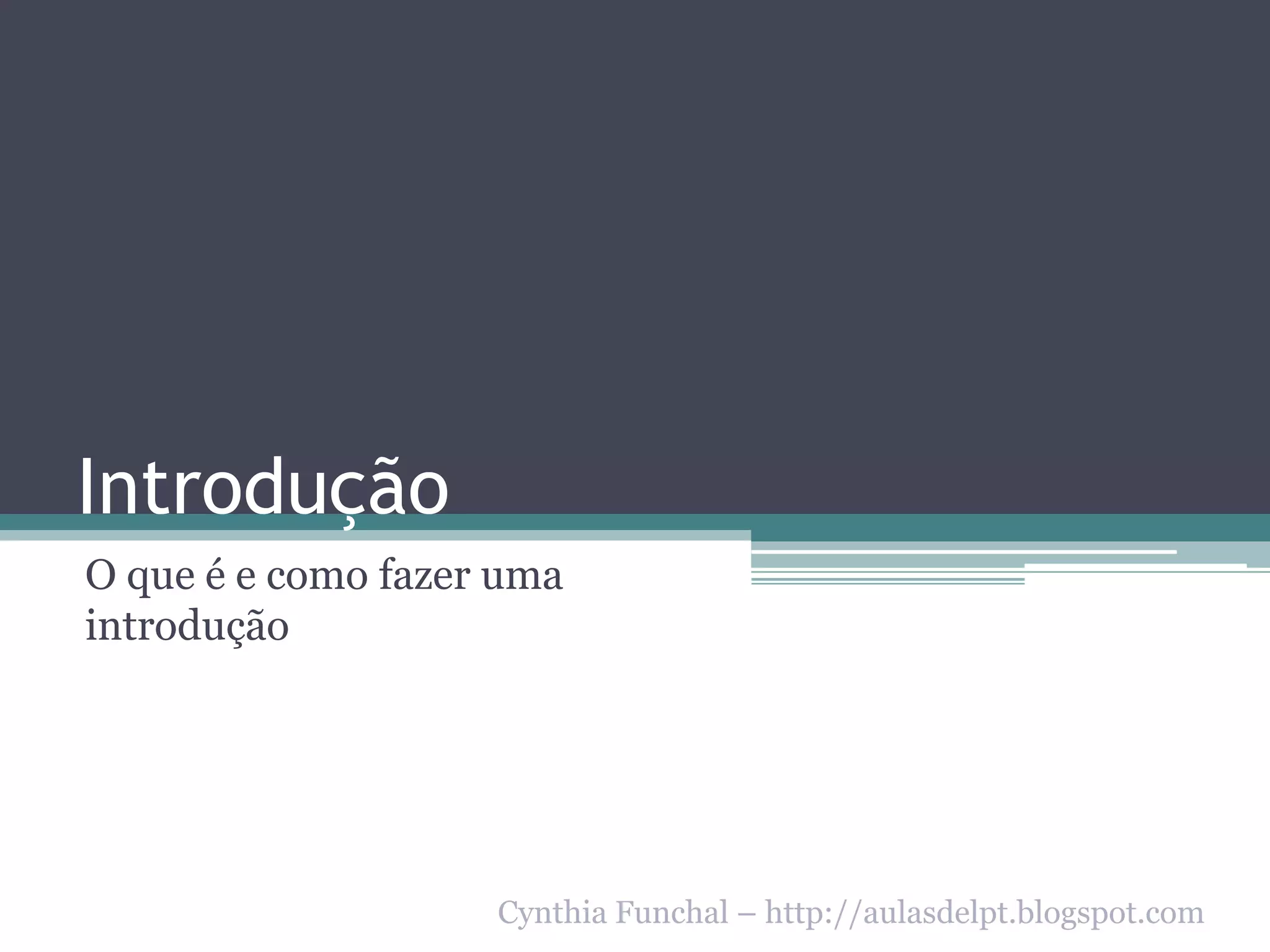 O documento discute o que é uma introdução em um texto, apresentando suas funções e alguns tipos como declaração, narrativa, hipótese, roteiro, alusão histórica e pergunta. Explica que a introdução deve apresentar a tese, o tema e a linha de raciocínio a ser seguida no texto.