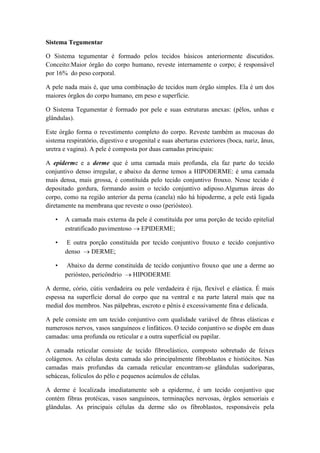 O documento descreve o sistema tegumentar, incluindo a pele, glândulas e unhas. A pele é o maior órgão do corpo e protege contra perda de água, atrito e raios UV. A pele é composta pela epiderme, derme e hipoderme, e desempenha funções como sensibilidade, regulação térmica e proteção contra infecções. O documento também discute várias doenças e condições da pele.