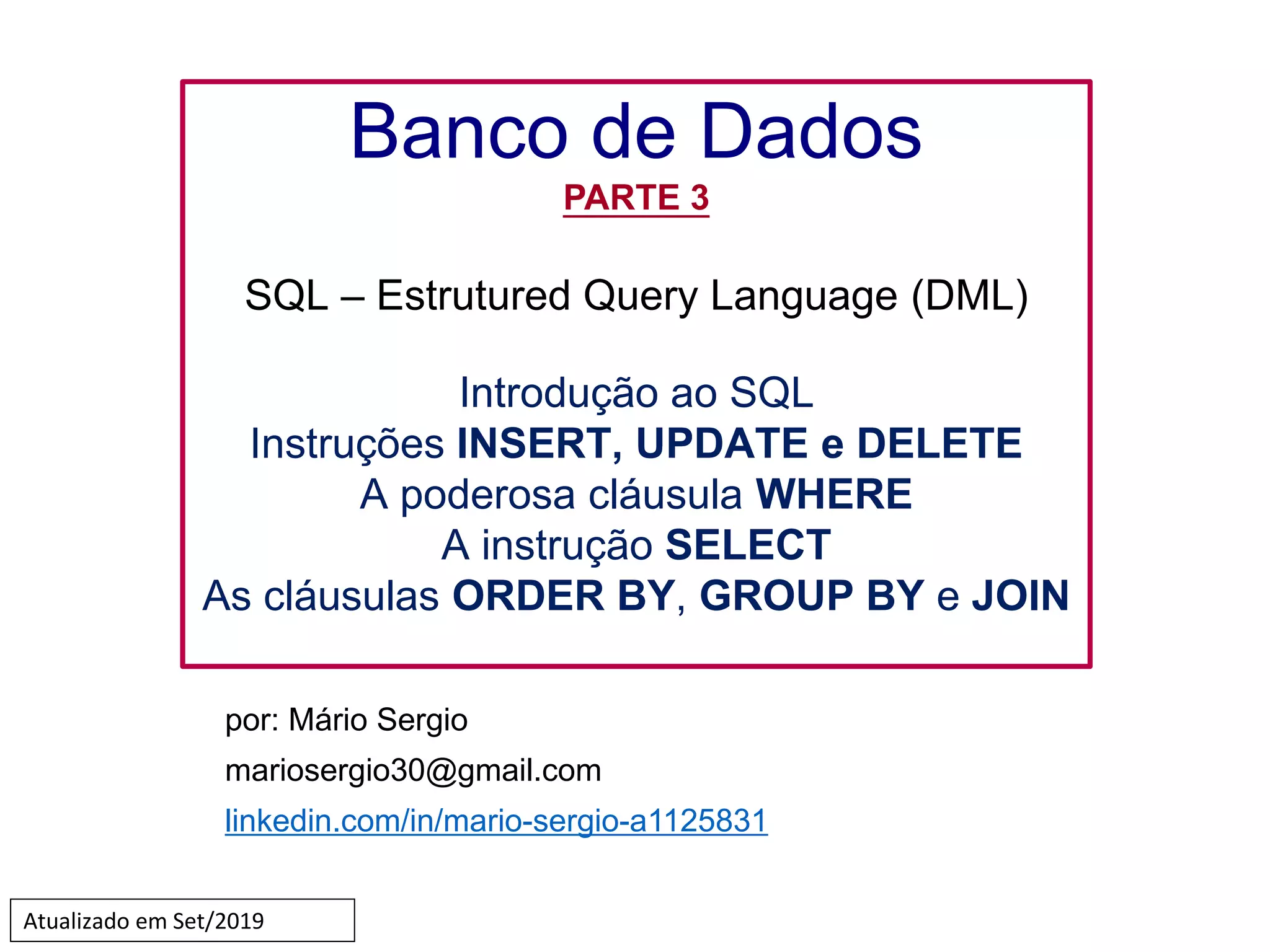 O documento discute a linguagem SQL e suas principais instruções para manipulação de dados em bancos de dados relacionais. Apresenta as instruções DML (INSERT, UPDATE, DELETE, SELECT) e suas cláusulas como WHERE, ORDER BY, GROUP BY e JOIN. Também explica funções agregadas como COUNT, SUM, AVG e o uso de alias para apelidar tabelas.